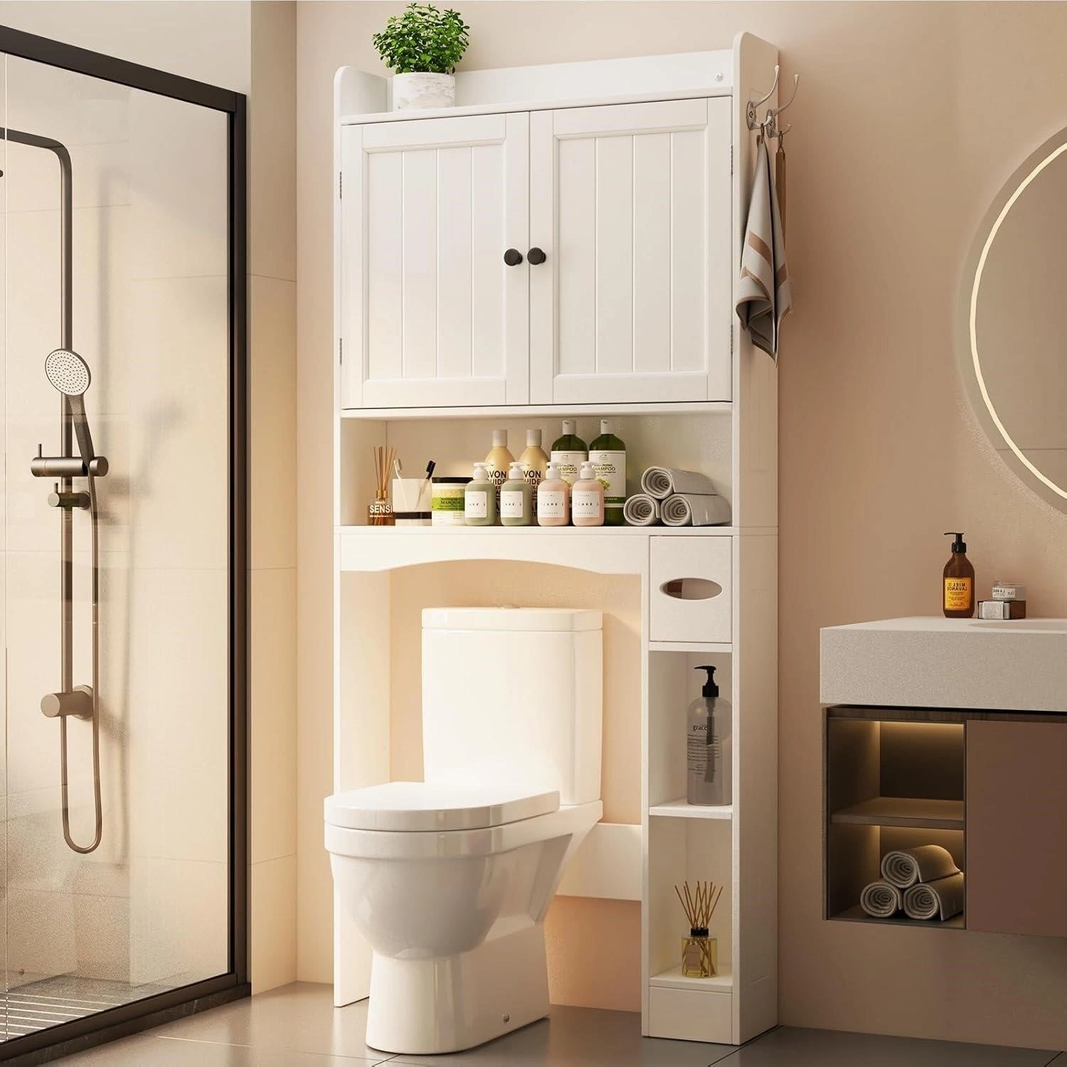 This over-the-toilet storage cabinet is a great way to maximize space in your bathroom. It's white and in great condition. The dimensions are 70.3" x 32.3" x 7.7". It provides ample storage space to keep your items organized.