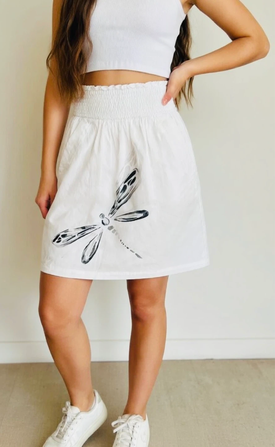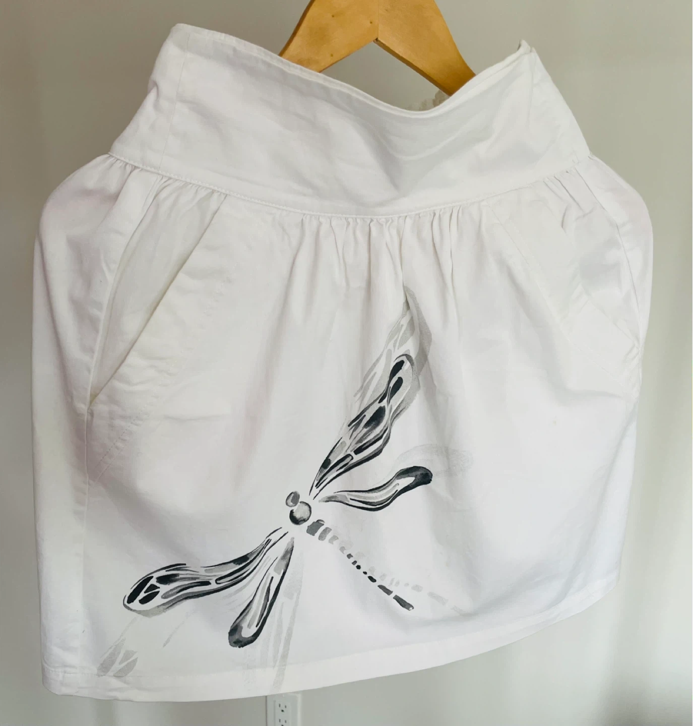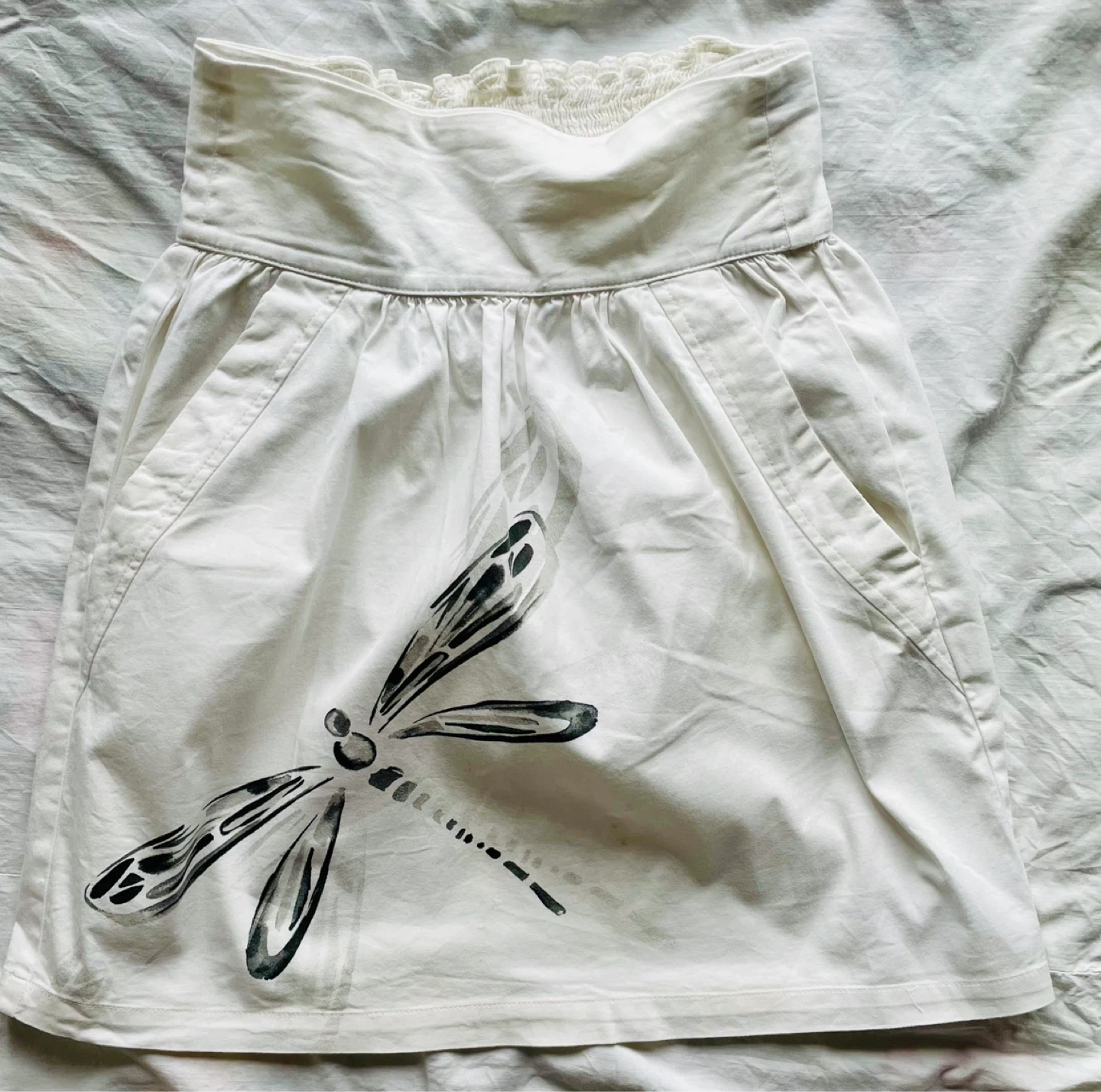 This is a white A-line skirt from Zara Basic with a smocked waistband and a decorative dragonfly print. It has two side pockets.