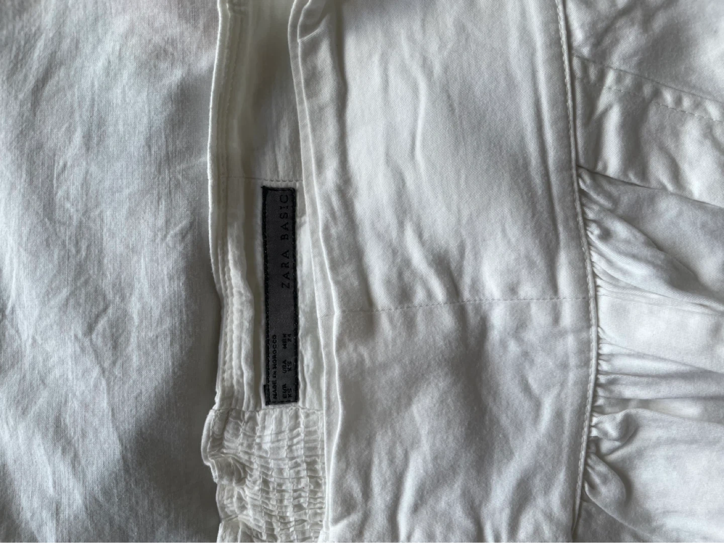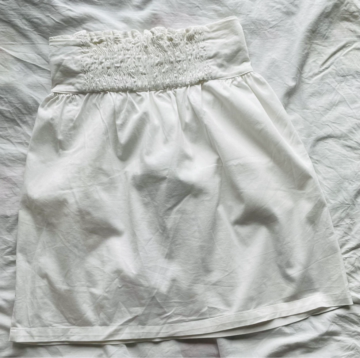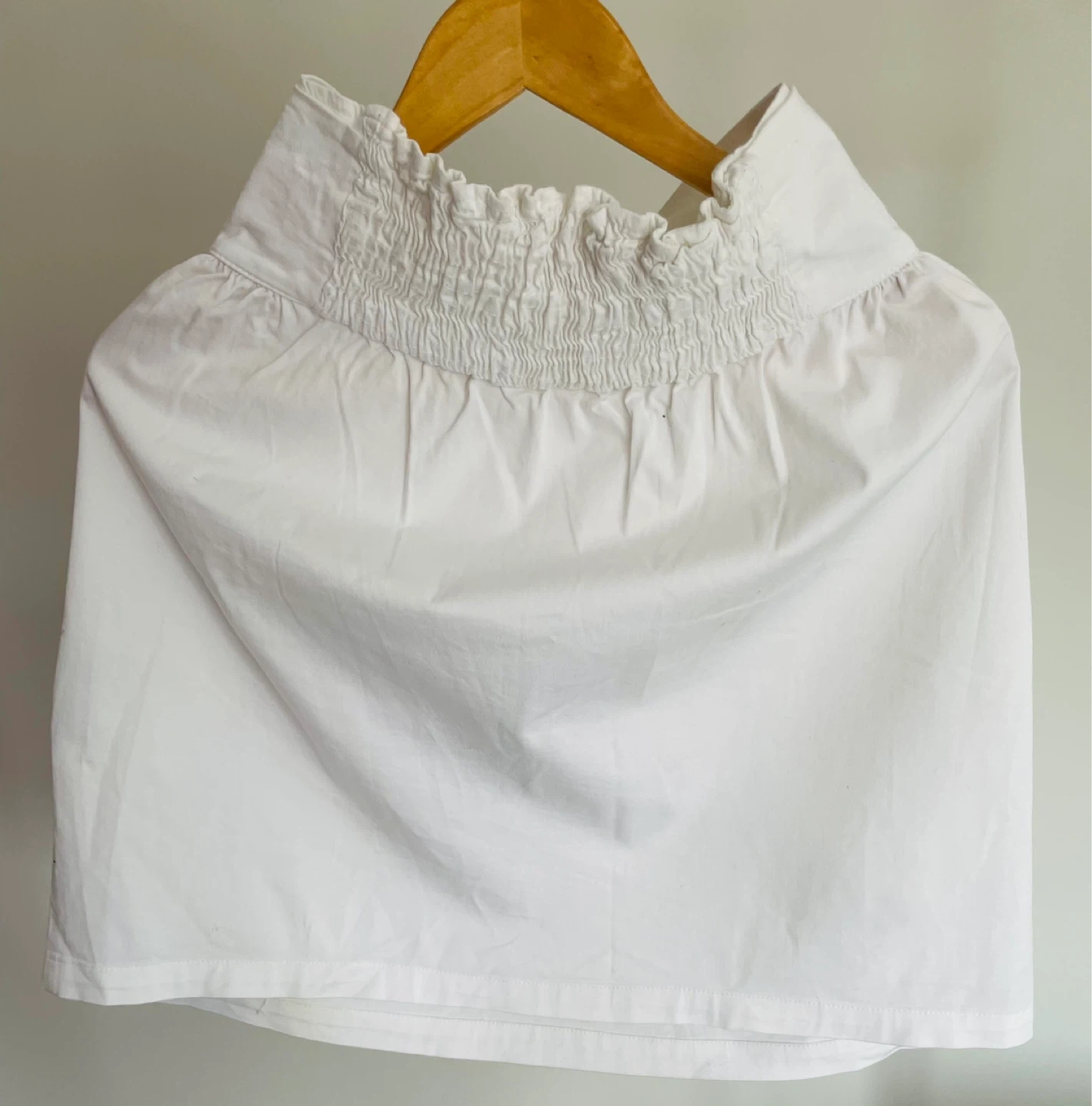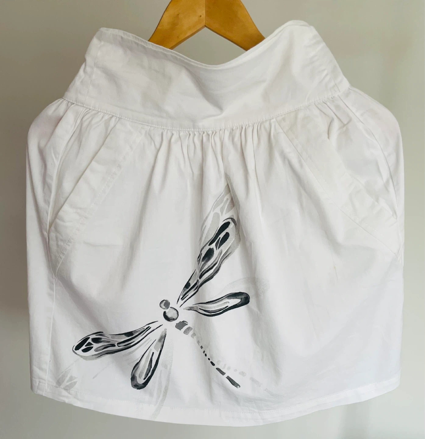 This is a white A-line skirt from Zara Basic with a smocked waistband and a decorative dragonfly print. It has two side pockets.