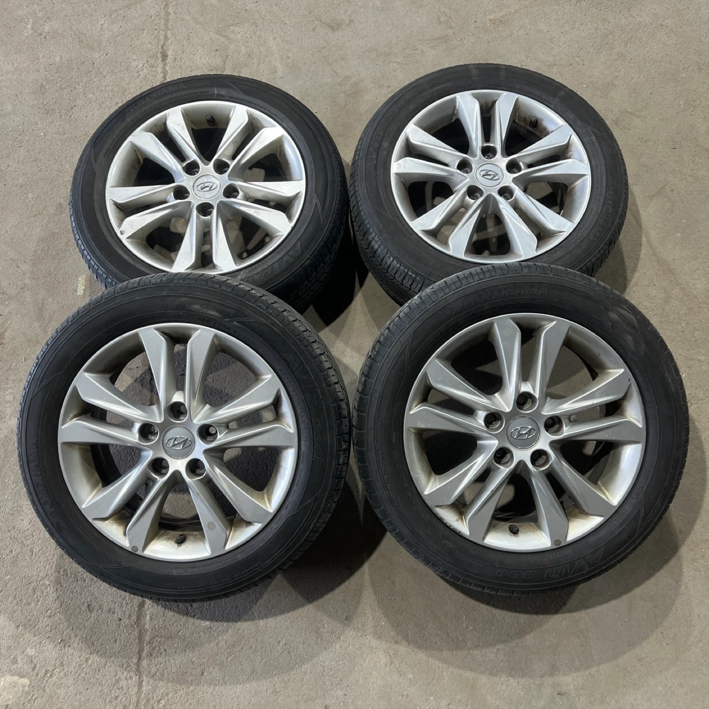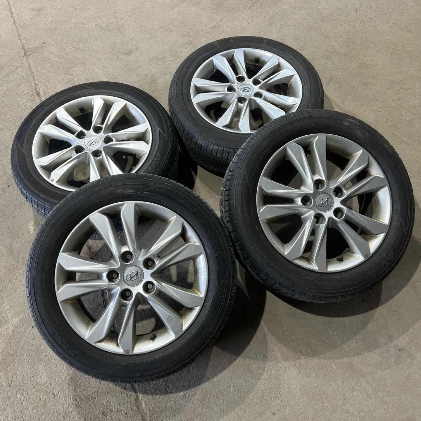 Set of four OEM Hyundai Elantra aluminum alloy rims 5x114.3 67.1 with Yokohama all season tires on it. Tires have about 50% tread left on them. Only good for about 1 season
