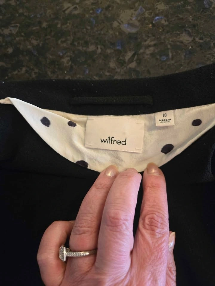 Size 10. Wilfred cavalier tuxedo blazer. Says dry clean only, but I have washed it many times. There are 2 small stains on the inside, as you can see in the pictures. Otherwise, it's in great shape and a really nice style. Located in Huntington Hills NW. Check out my other listings for deals on multiple items!