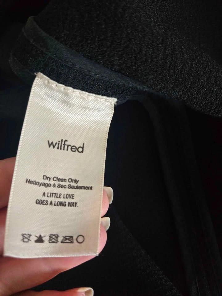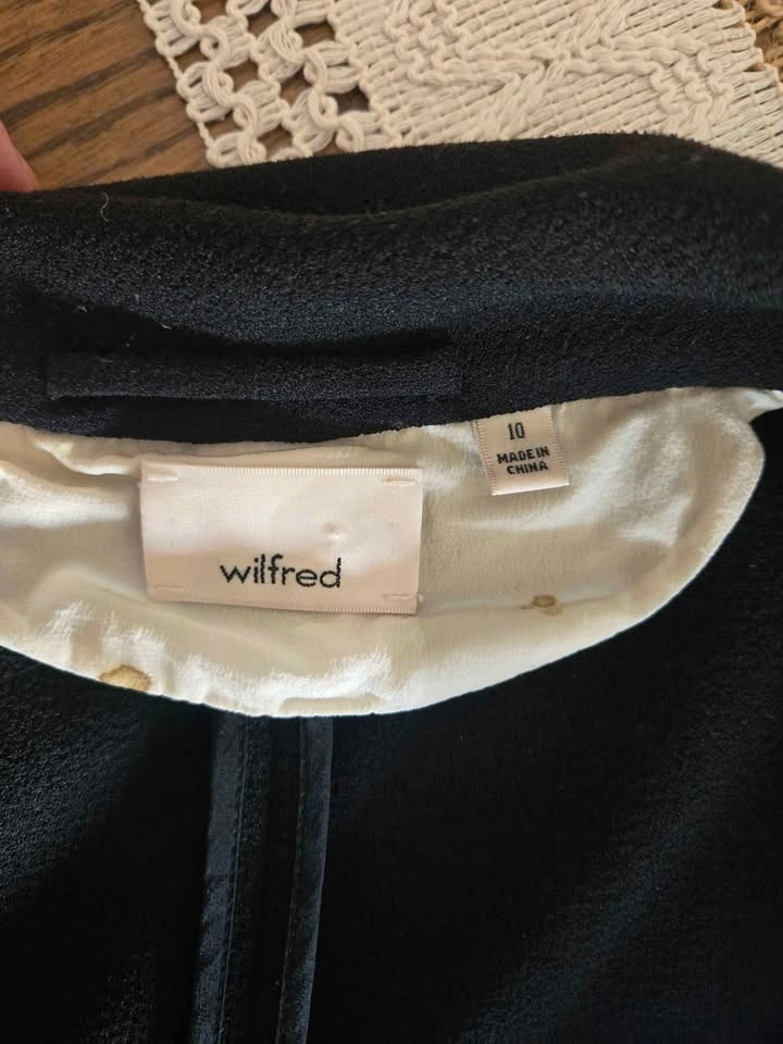 Size 10. Wilfred cavalier tuxedo blazer. Says dry clean only, but I have washed it many times. There are 2 small stains on the inside, as you can see in the pictures. Otherwise, it's in great shape and a really nice style. Located in Huntington Hills NW. Check out my other listings for deals on multiple items!