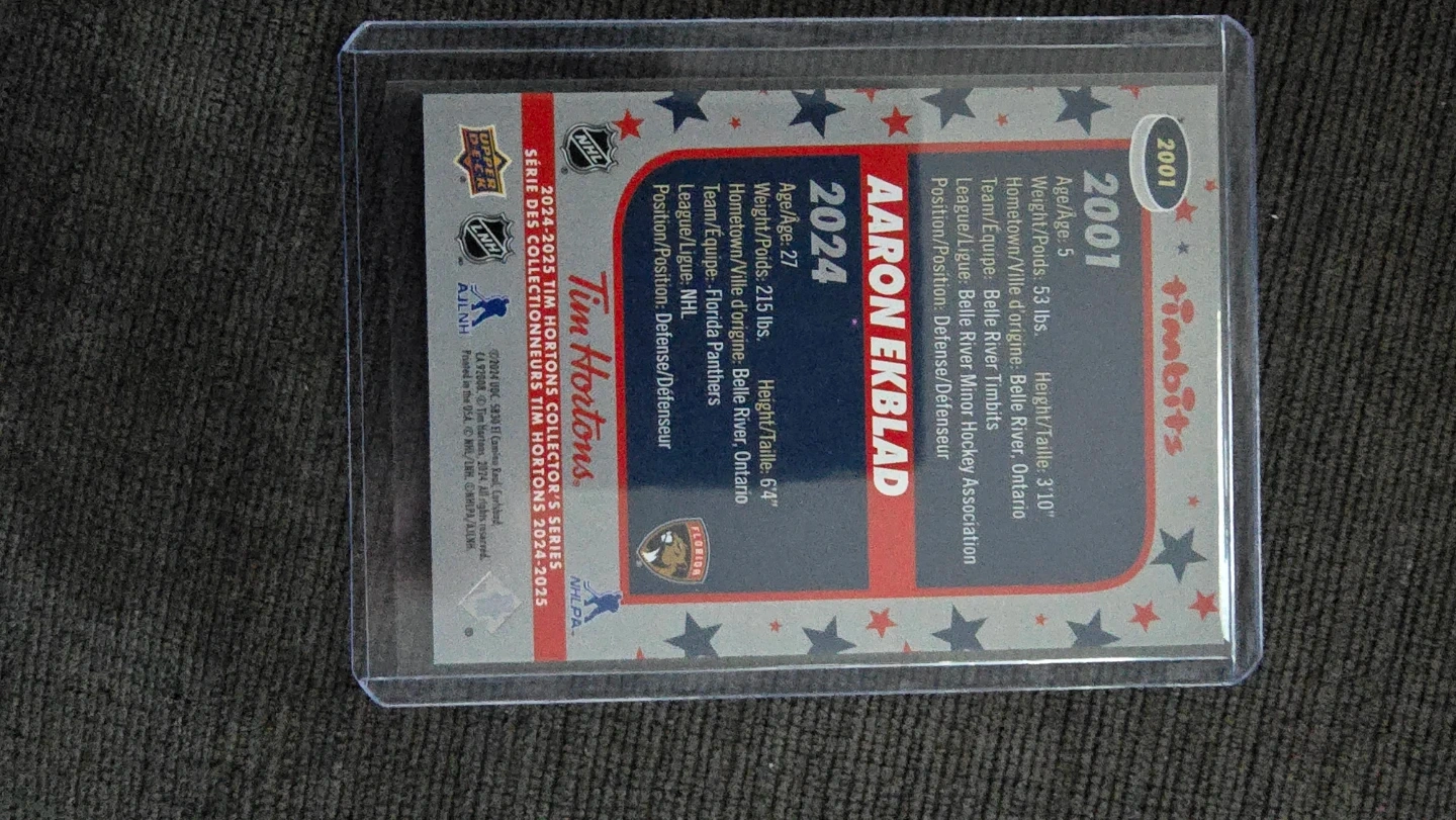 This is the 2001 Tim Hortons Timbits hockey card featuring Aaron Ekblad. It's a collectible card from the 2001 series. The card lists his details from the 2024-2025 season.