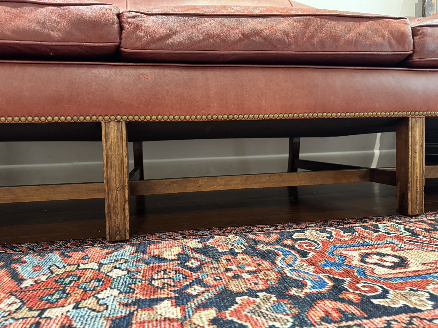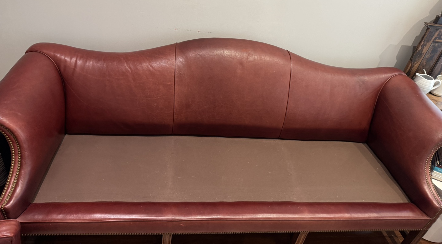 *Keywords: vintage sofa, leather furniture, camelback sofa, traditional furniture, burgundy leather, brass nailheads, Chippendale style, antique furniture*