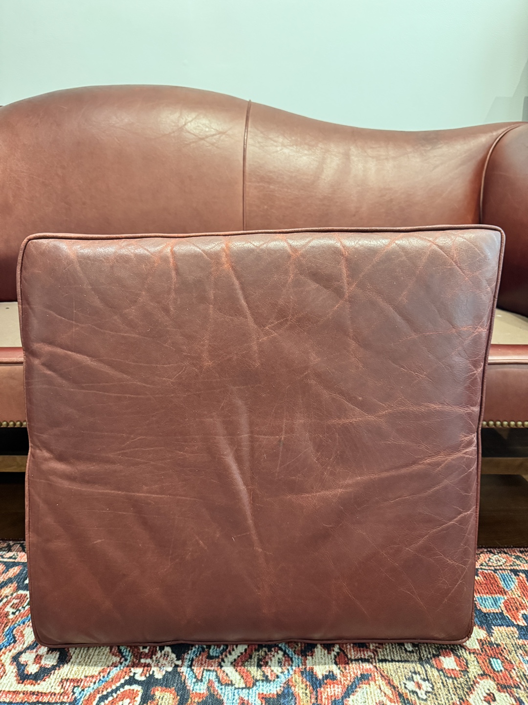 - **Rich burgundy leather** with beautiful patina and character