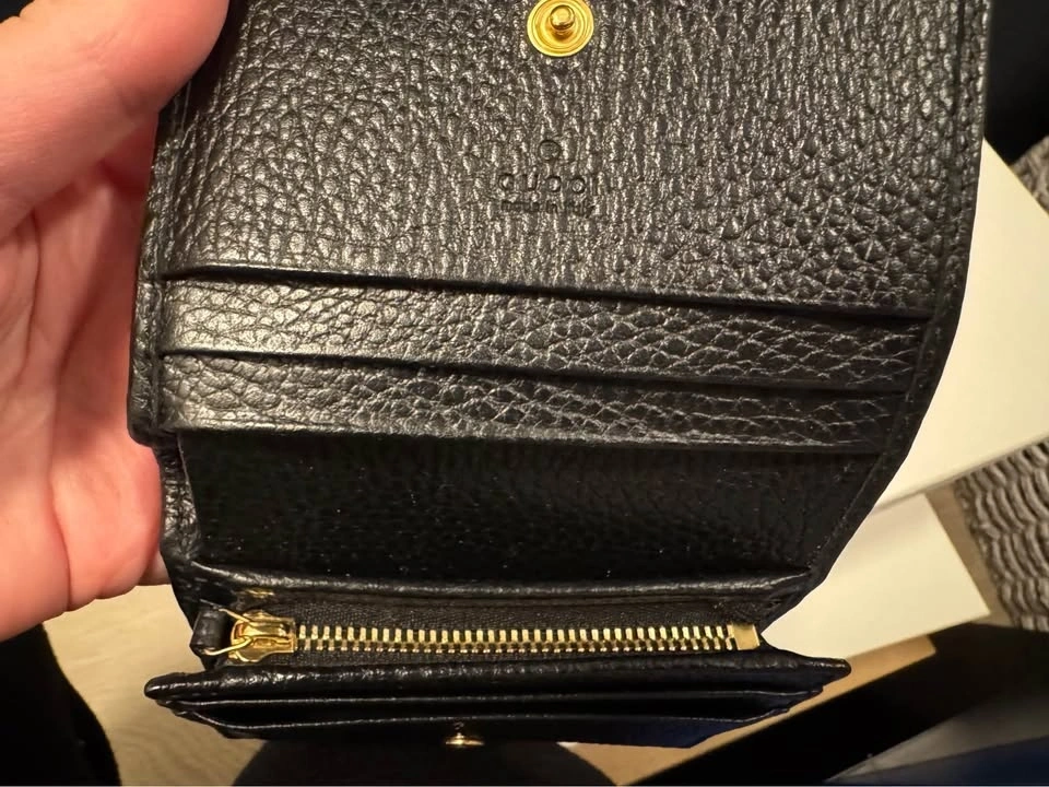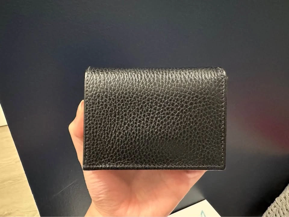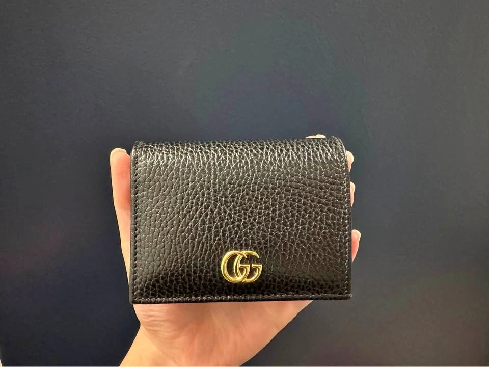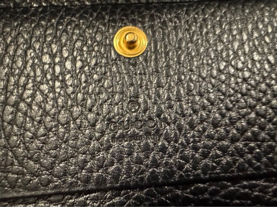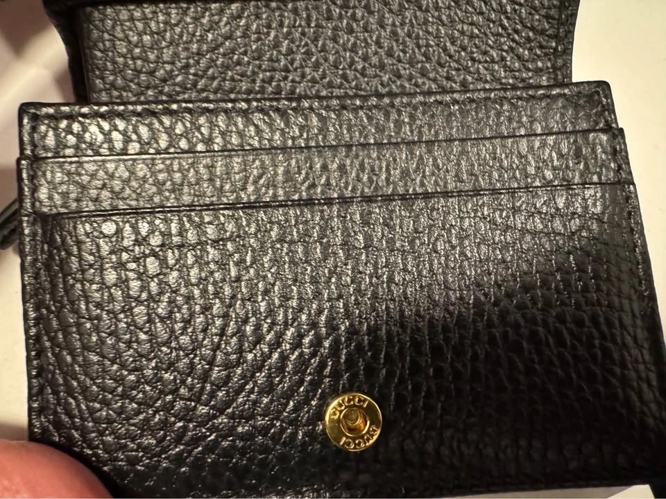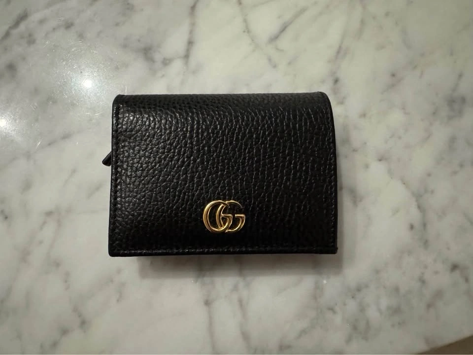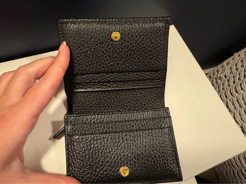 Authentic Gucci GG Marmont card case wallet. Black pebbled leather with gold GG logo. Has card slots and a snap closure. Super compact, great for everyday. In excellent condition.