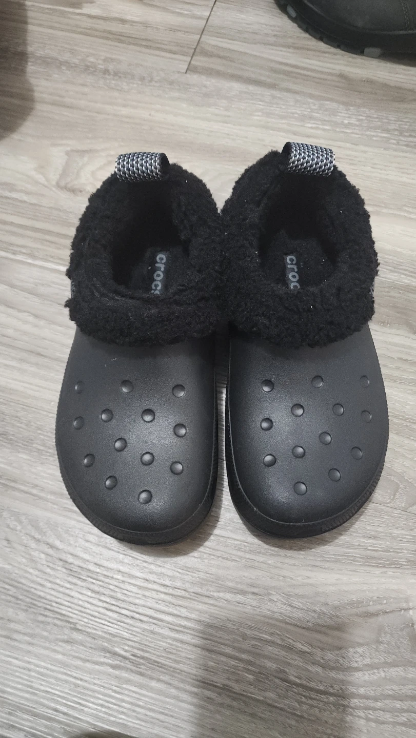 Crocs classic lined shorty slippers in black. These comfy clogs are lined with plush faux fur for extra warmth. Perfect for chilly days indoors or quick errands outside. Size is US 6/8.