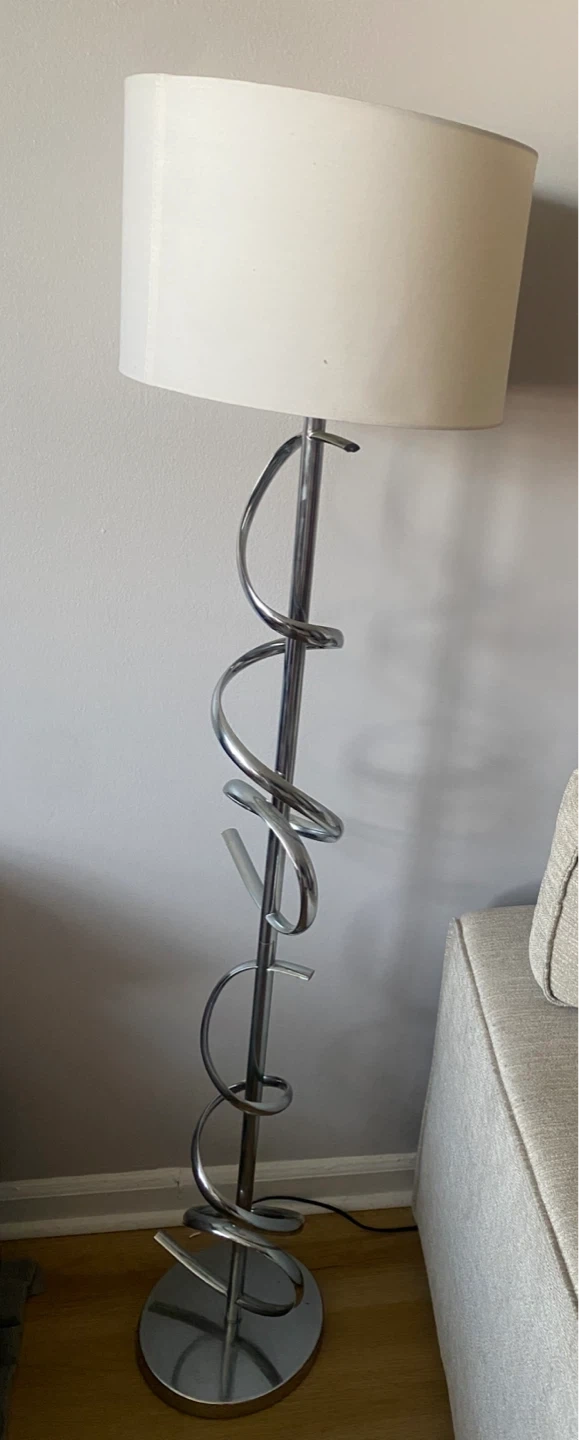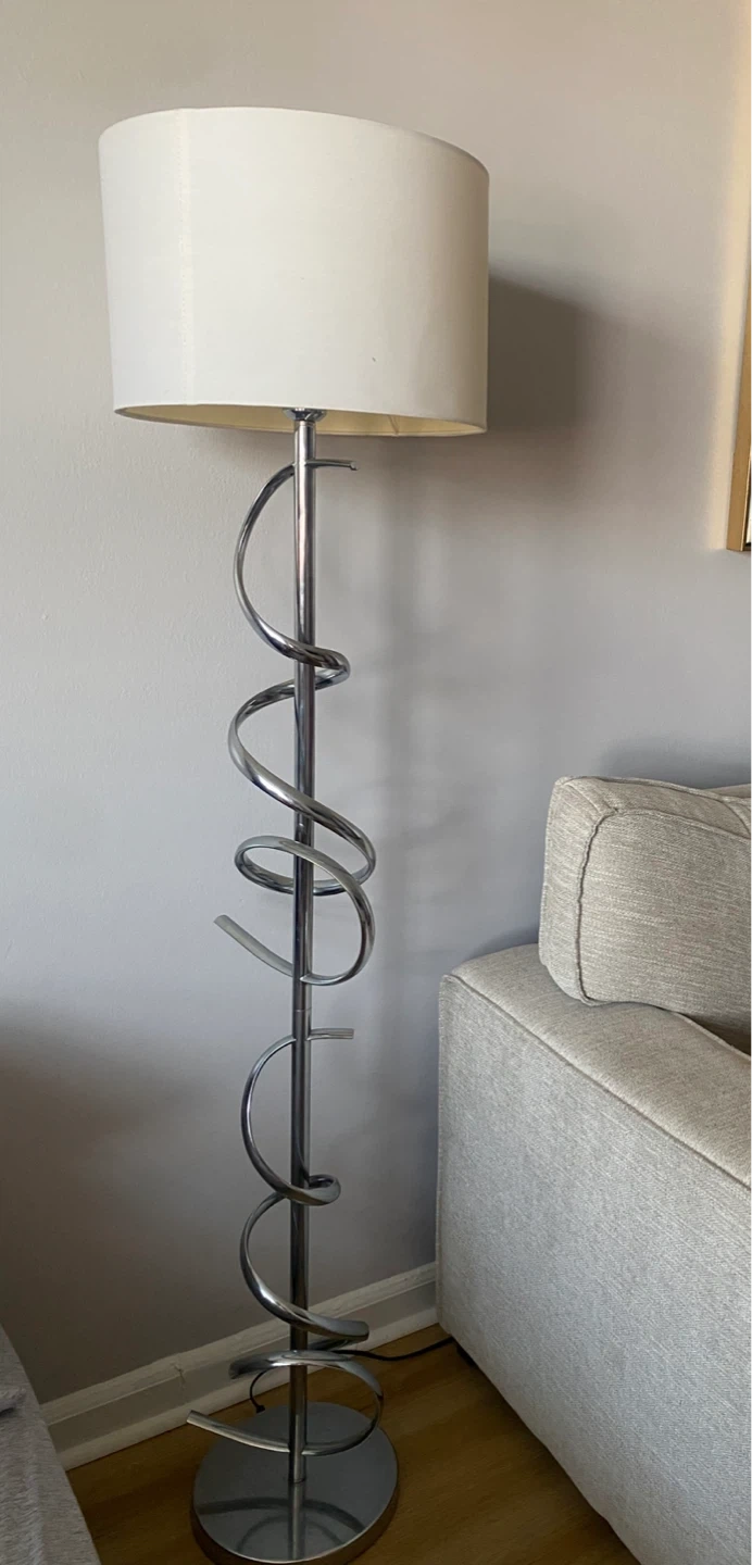 This stylish floor lamp features a unique chrome spiral design and a clean white drum shade. It's perfect for adding ambient lighting to any room. The lamp requires a standard light bulb, It’s included.