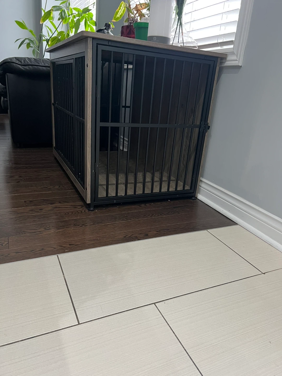 Selling a dog crate that doubles as an end table! It's in great condition and blends seamlessly with home decor. The crate features a sturdy wooden frame with black metal bars, providing a safe and stylish space for your furry friend