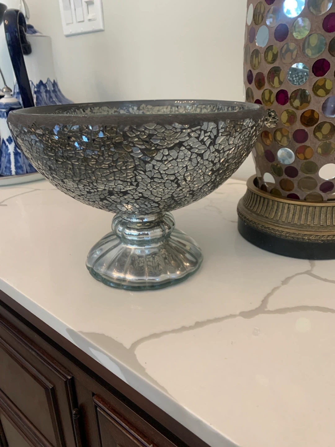 Mosaic glass pedestal bowl and matching vase. The bowl has a textured grey mosaic finish, while the vase features a colourful mosaic pattern with metallic accents. Both pieces have a metallic base.Vase is a Partylite candle holder both for 20