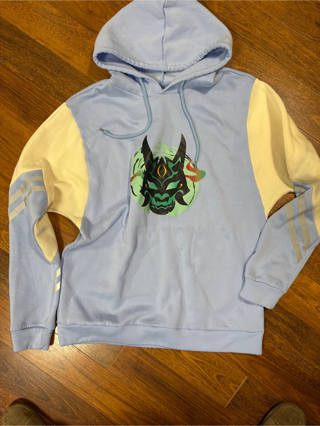 GENSHIN blue hoodie, size XXL. It features a unique design on the front and has a comfortable fit. Perfect for casual wear!