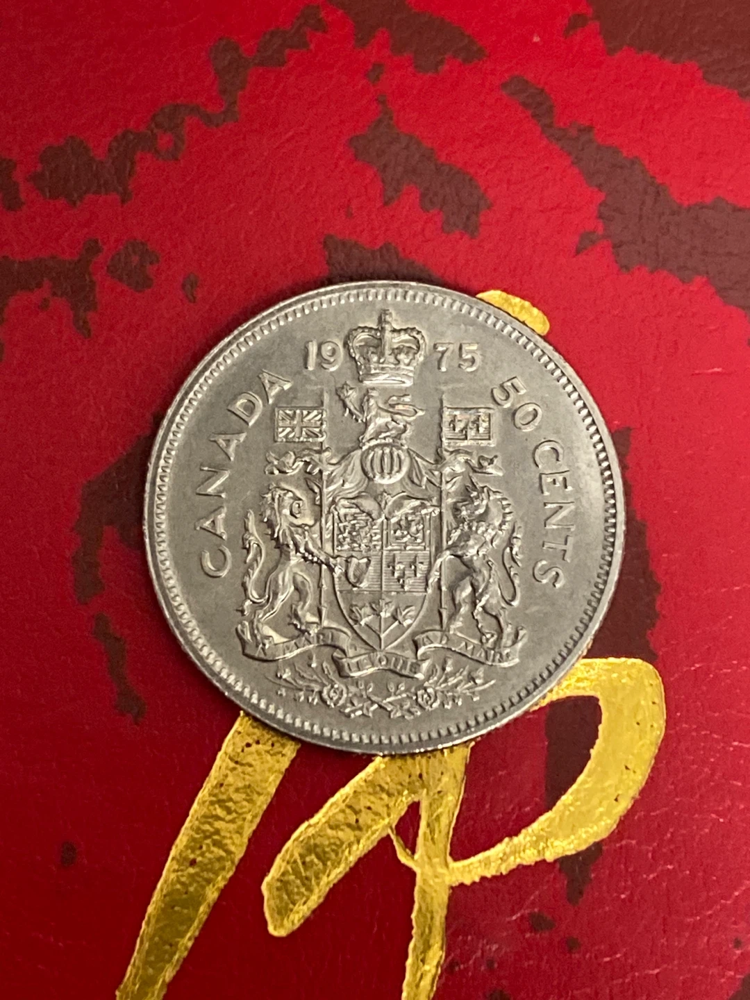 This is a 1975 Canadian 50 cent coin featuring Queen Elizabeth II on one side and the Royal Coat of Arms on the other. It's made of cupronickel alloy. A nice coin for collectors!