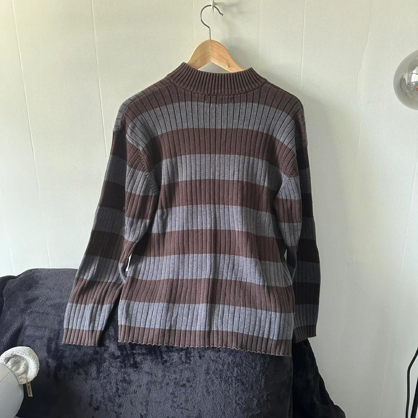 brown grey striped, quarter zip, cozy knit, casual sweater, oversized fit, autumn fashion, relaxed fit, textured fabric, collegiate style, everyday wear