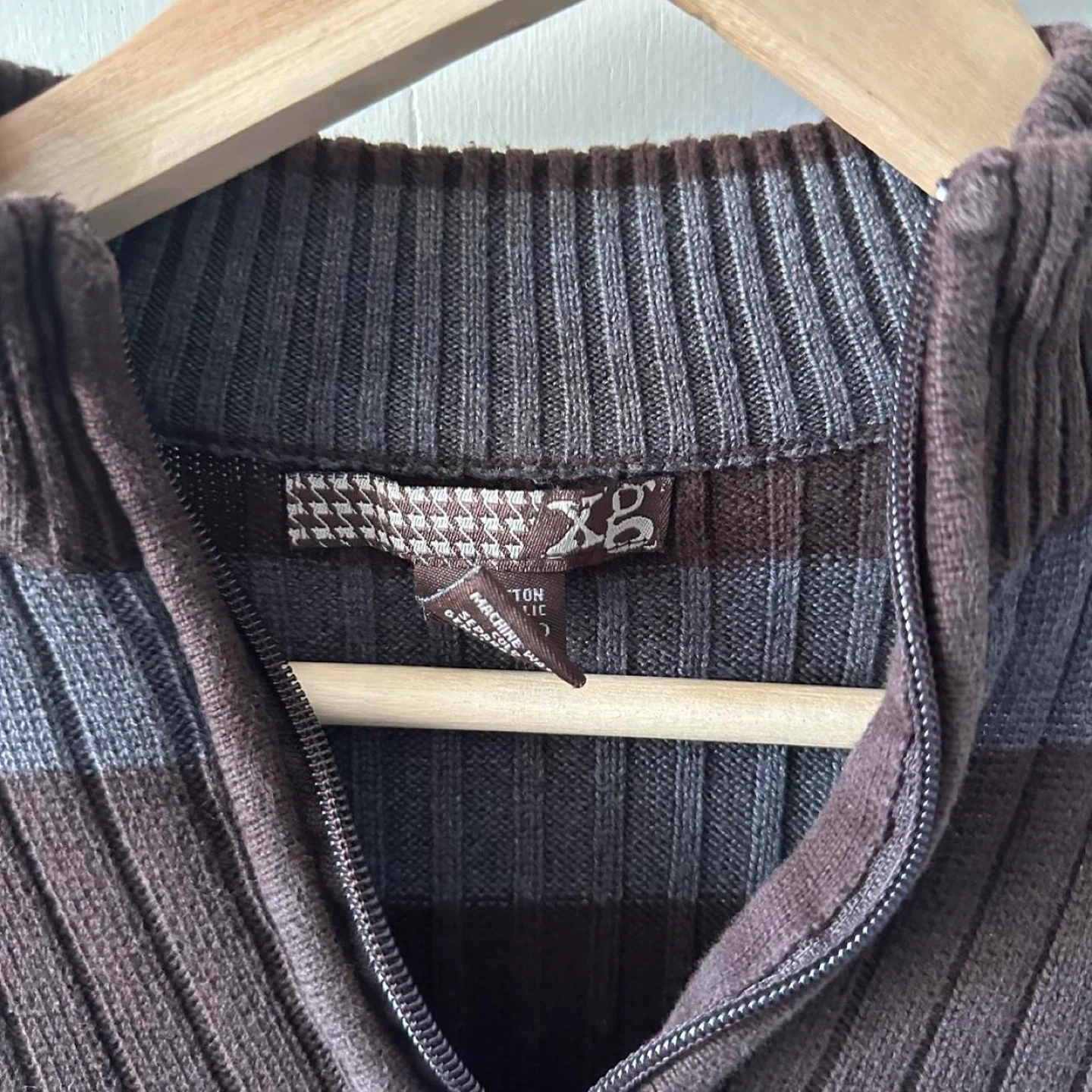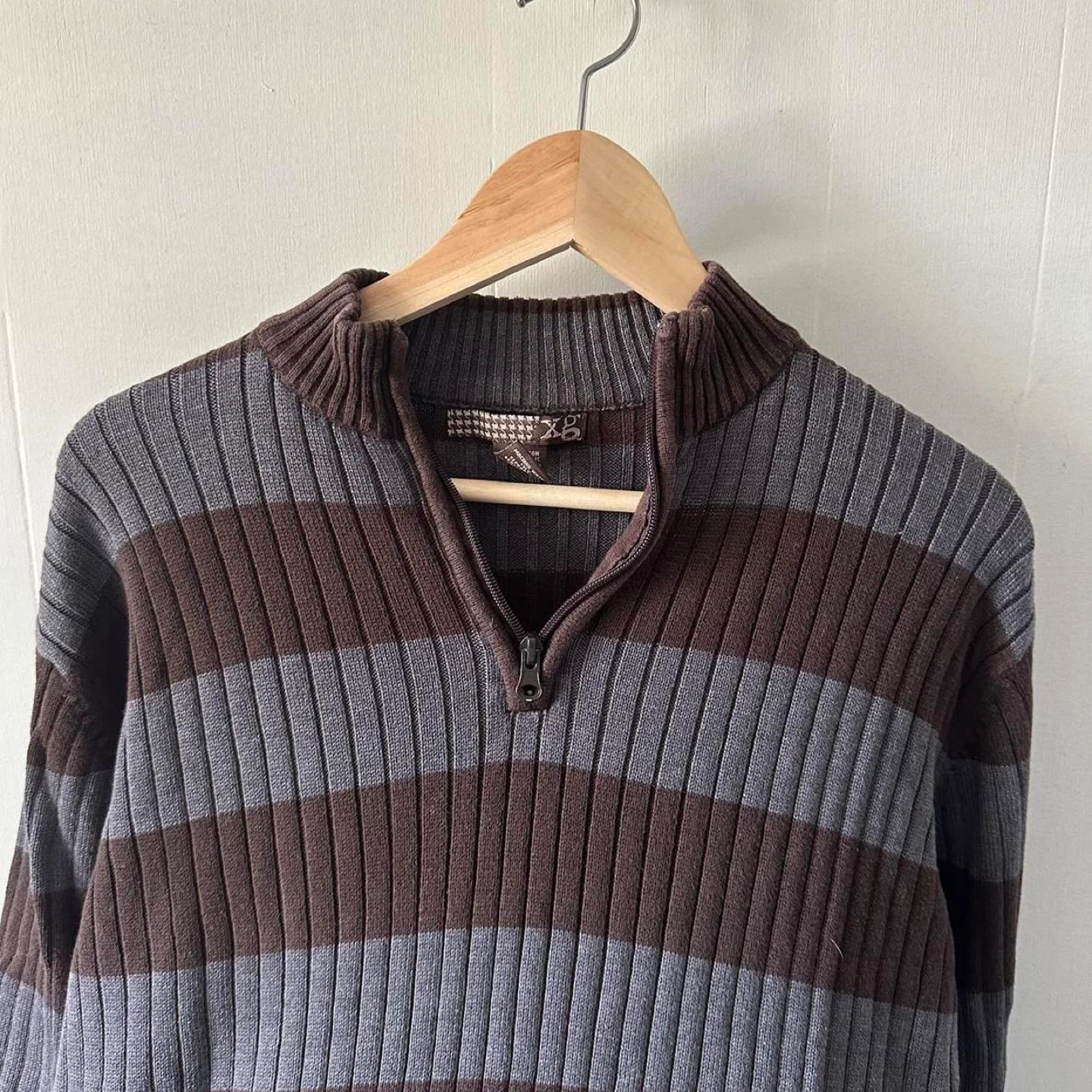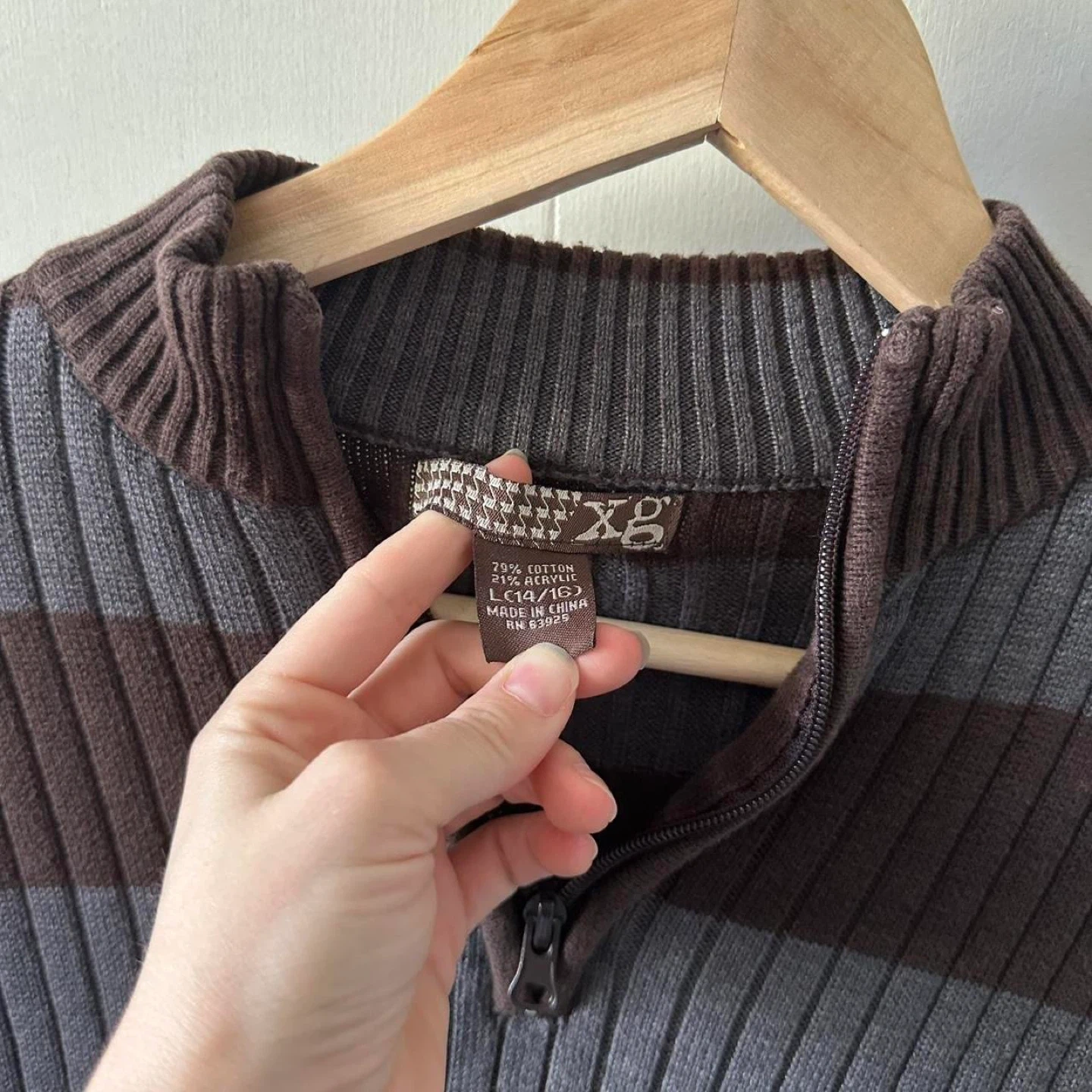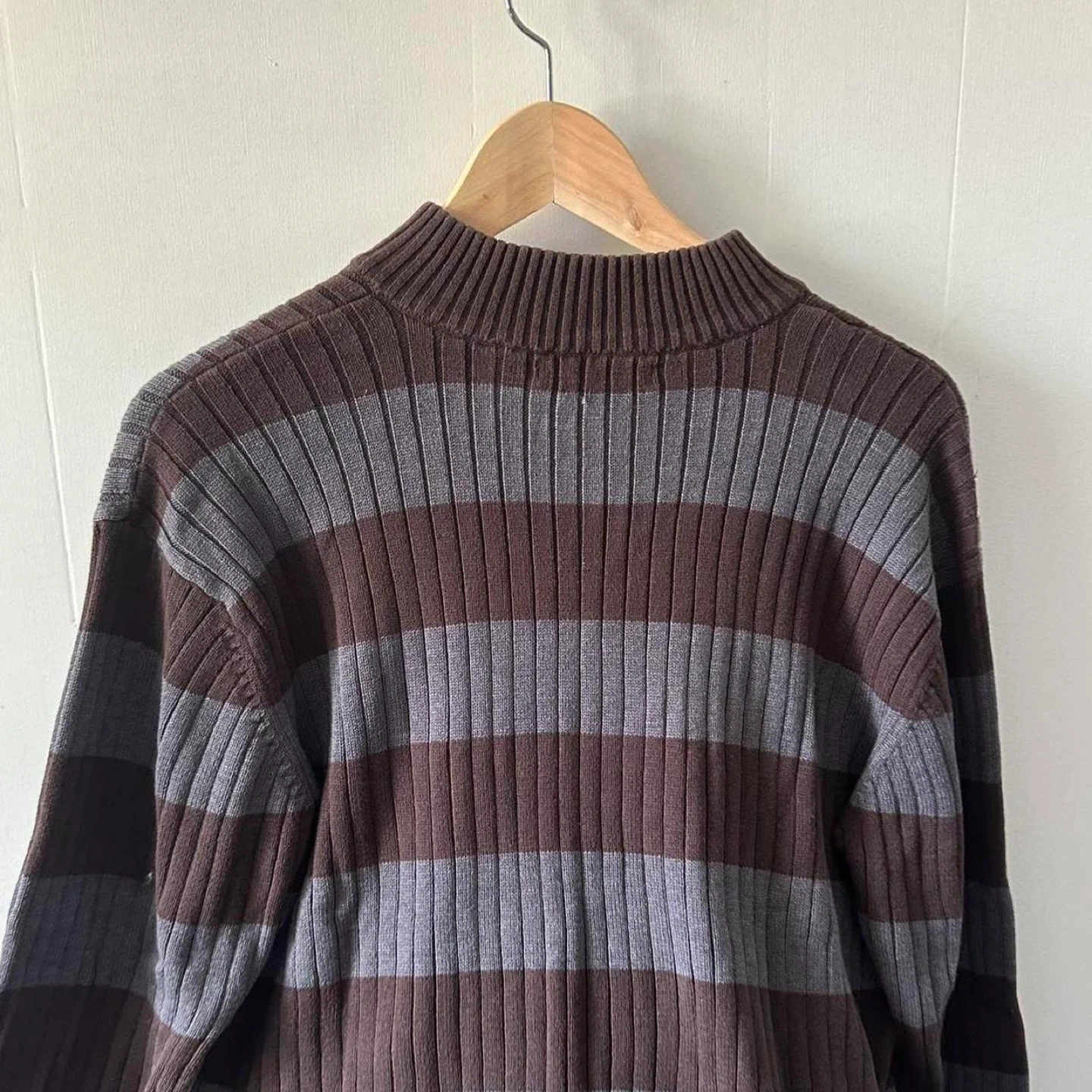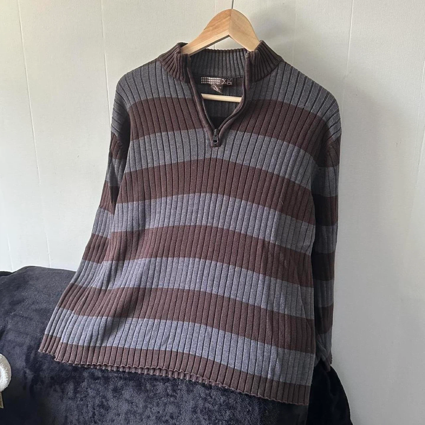 brown grey striped, quarter zip, cozy knit, casual sweater, oversized fit, autumn fashion, relaxed fit, textured fabric, collegiate style, everyday wear