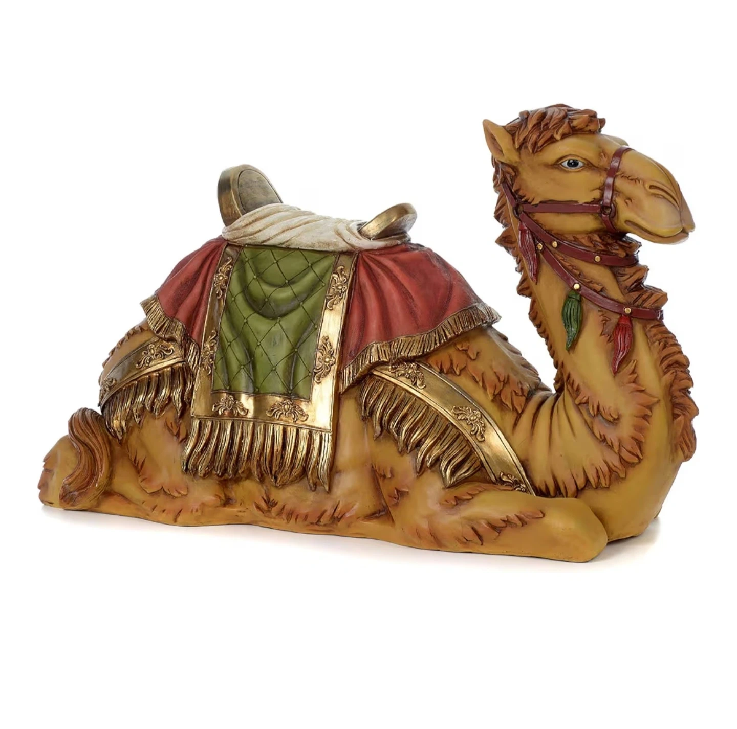 A detailed figurine of a camel adorned with a decorative saddle blanket. This piece features rich colours and ornate gold trim. It's designed to be a striking display item.