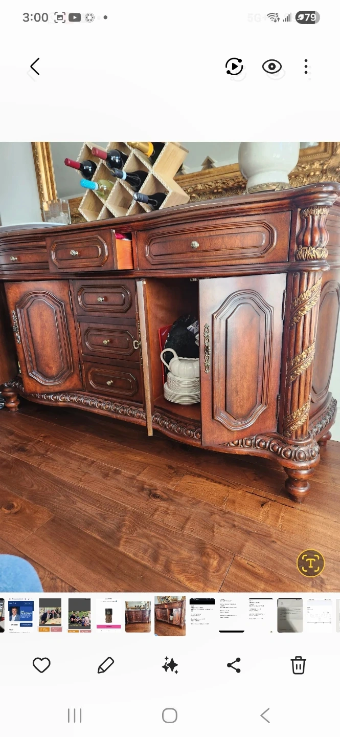 Beautiful dark wood buffet server with detailed carvings. It features multiple drawers and two cabinet doors for ample storage. Perfect for dining rooms or as a console table.