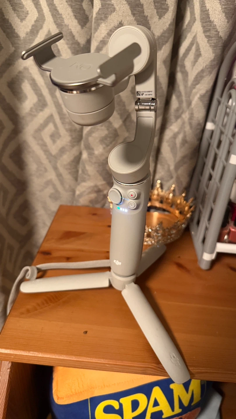 This is a DJI OM 5 smartphone gimbal in grey. It's lightweight and foldable for easy portability. It helps stabilize your phone for smooth video recording.