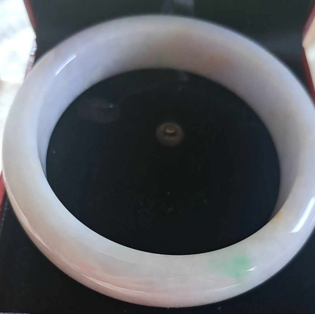This is a beautiful jade bangle bracelet. It features a polished finish with subtle pink and green hues. The material is jadeite