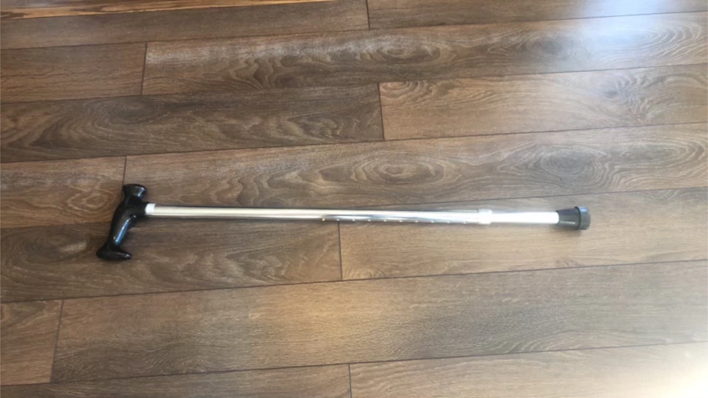 This is an adjustable aluminum walking cane with a black handle. It features a silver shaft with multiple height settings. The non-slip rubber tip provides stability.