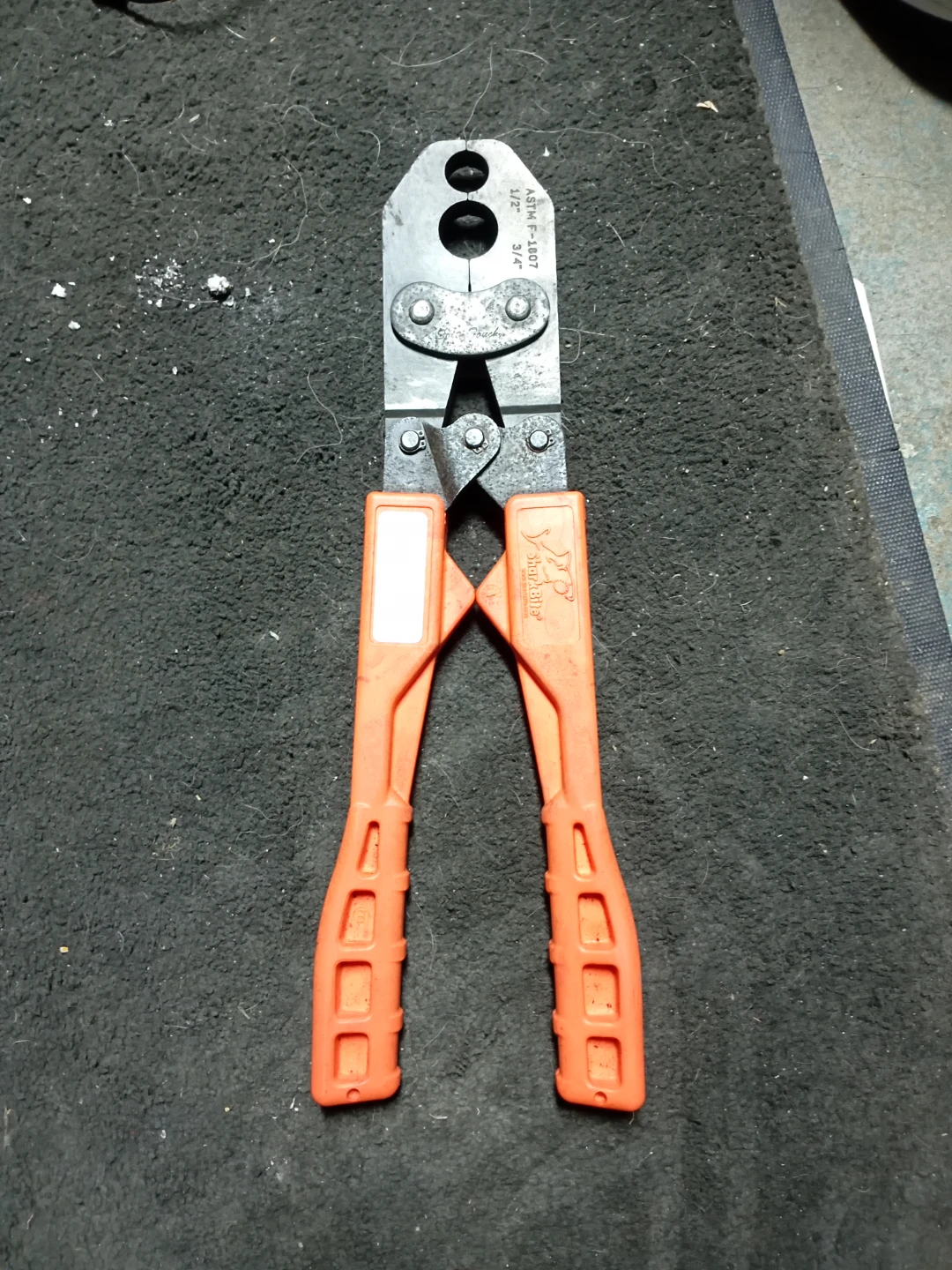 This is a Sharpe Bite crimping tool. It's designed for 1/2" and 3/4" sizes. The tool features orange grips for comfort.
