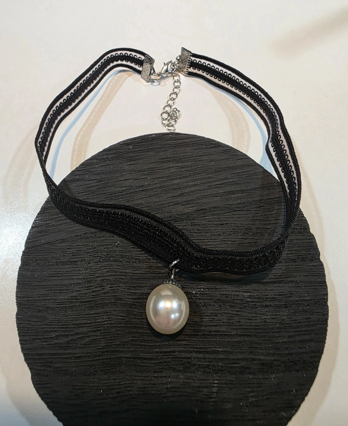 Chic black velvet choker with a delicate lace trim and a single pearl pendant. It features a lobster clasp closure and an adjustable chain for a comfortable fit.