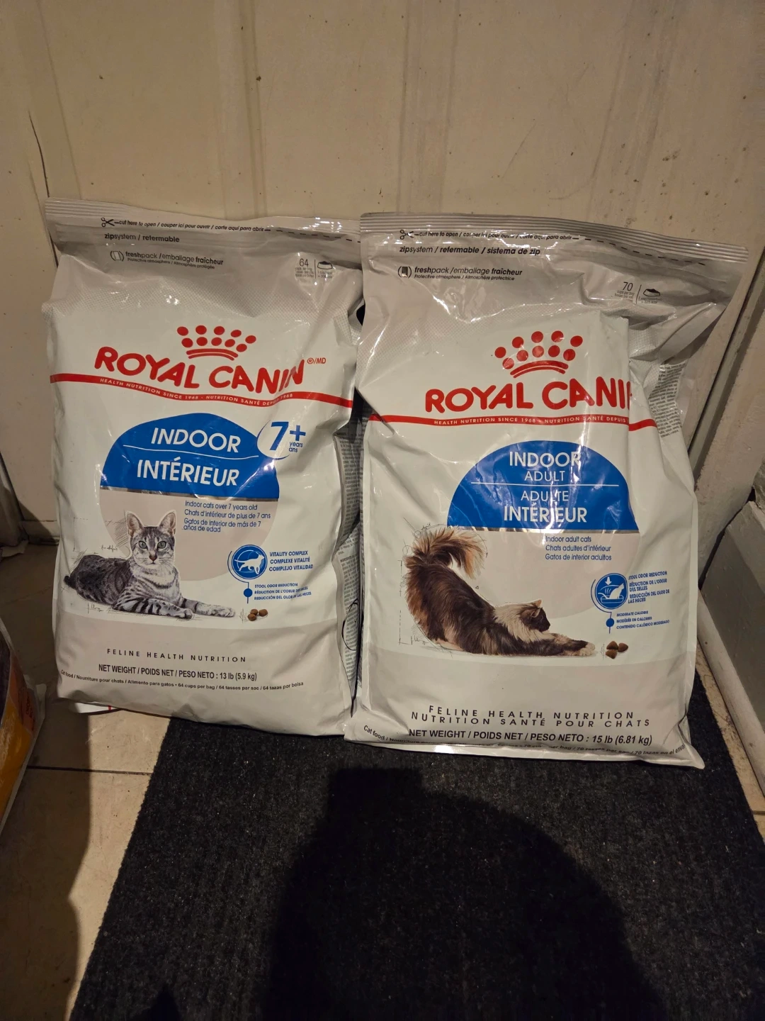 Two bags of Royal Canin Feline Health Nutrition Indoor cat food. One bag is 13 lb for cats 7+ years old, and the other is 15 lb for adult indoor cats. Both bags are sealed.