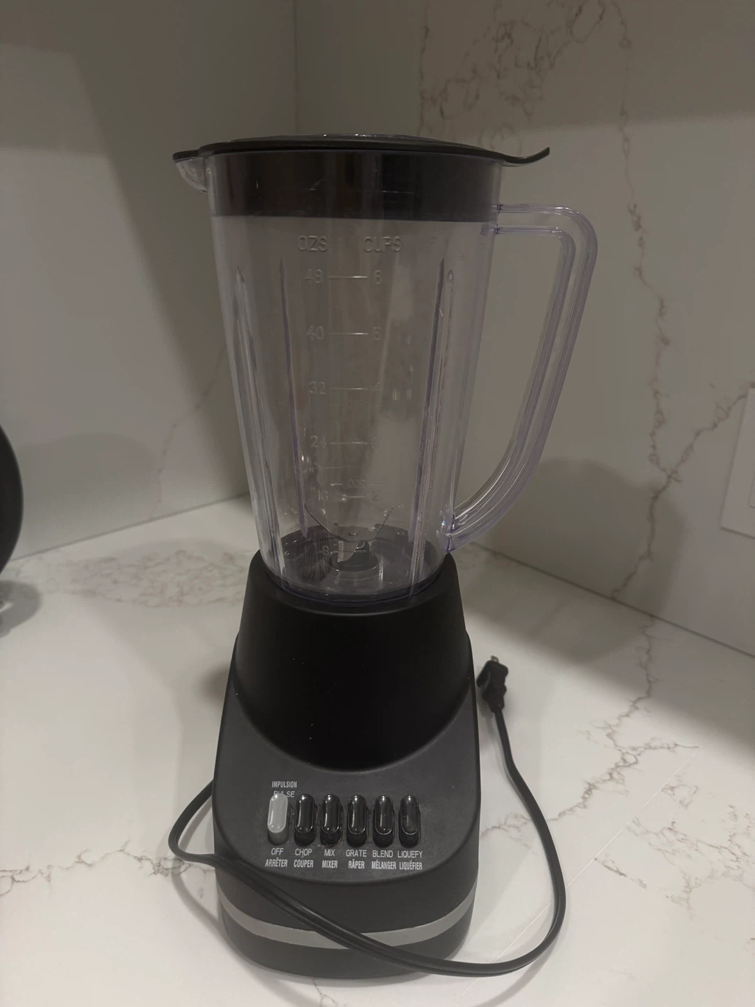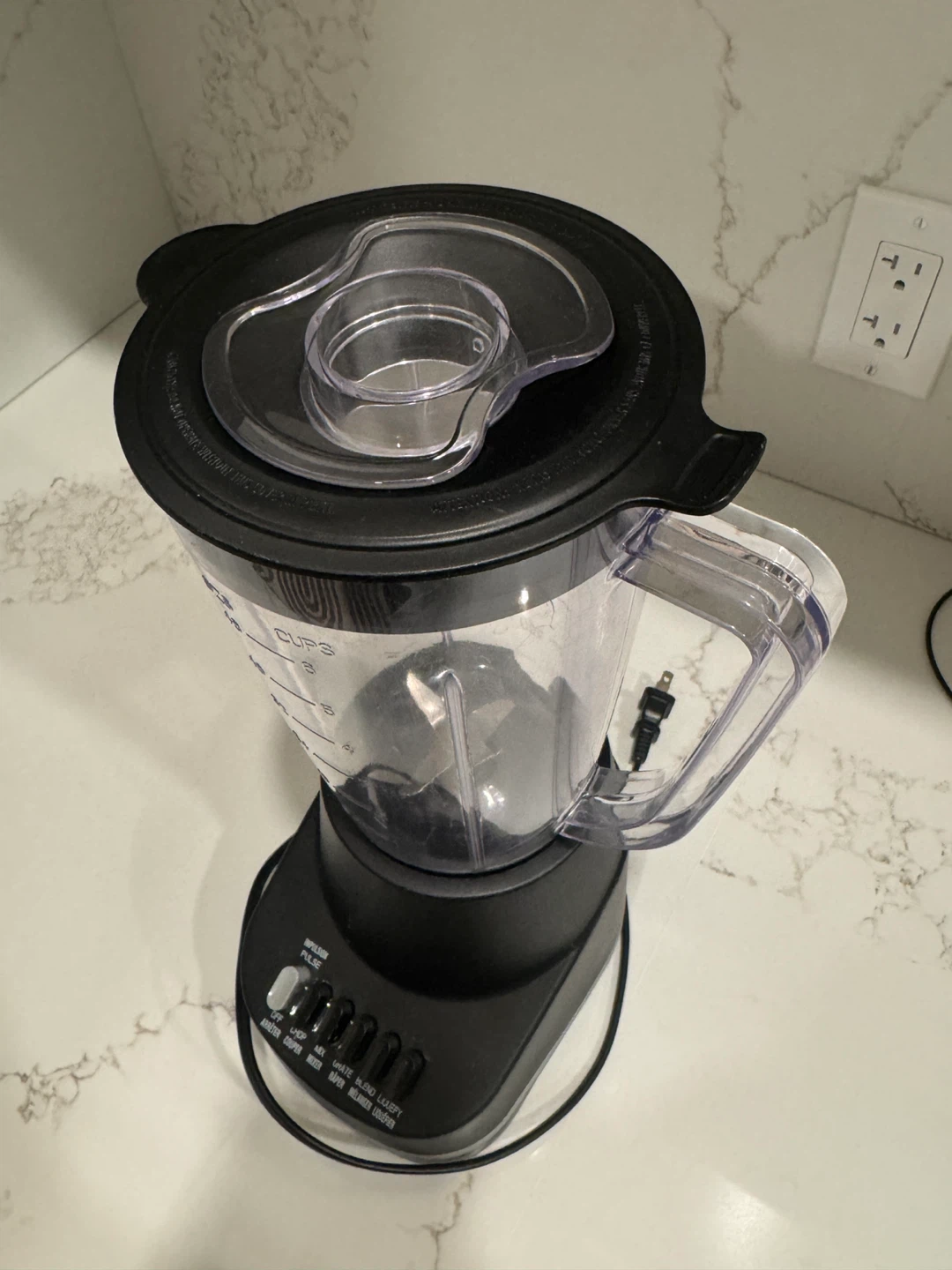 This is a black kitchen blender with multiple speed settings. It has a clear jug with measurement markings. The lid has a removable centre for adding ingredients while blending.