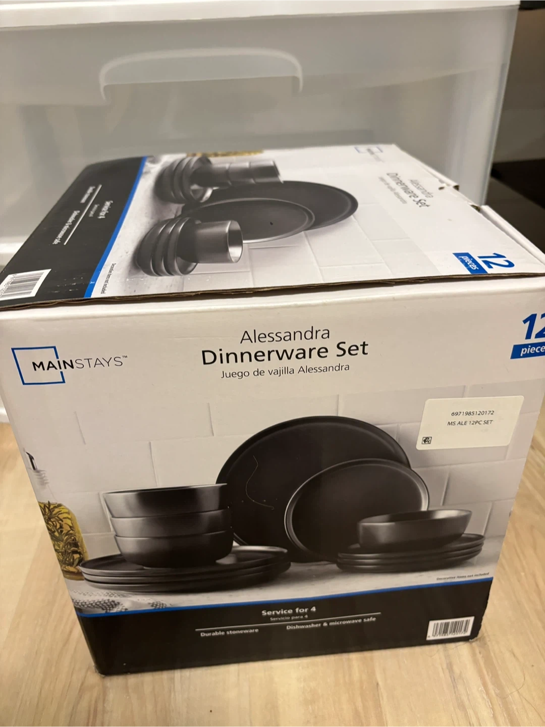 This is the Mainstays Alessandra Dinnerware Set. It's a 12-piece set designed for service for 4. The dinnerware is made of durable stoneware and is dishwasher and microwave safe.