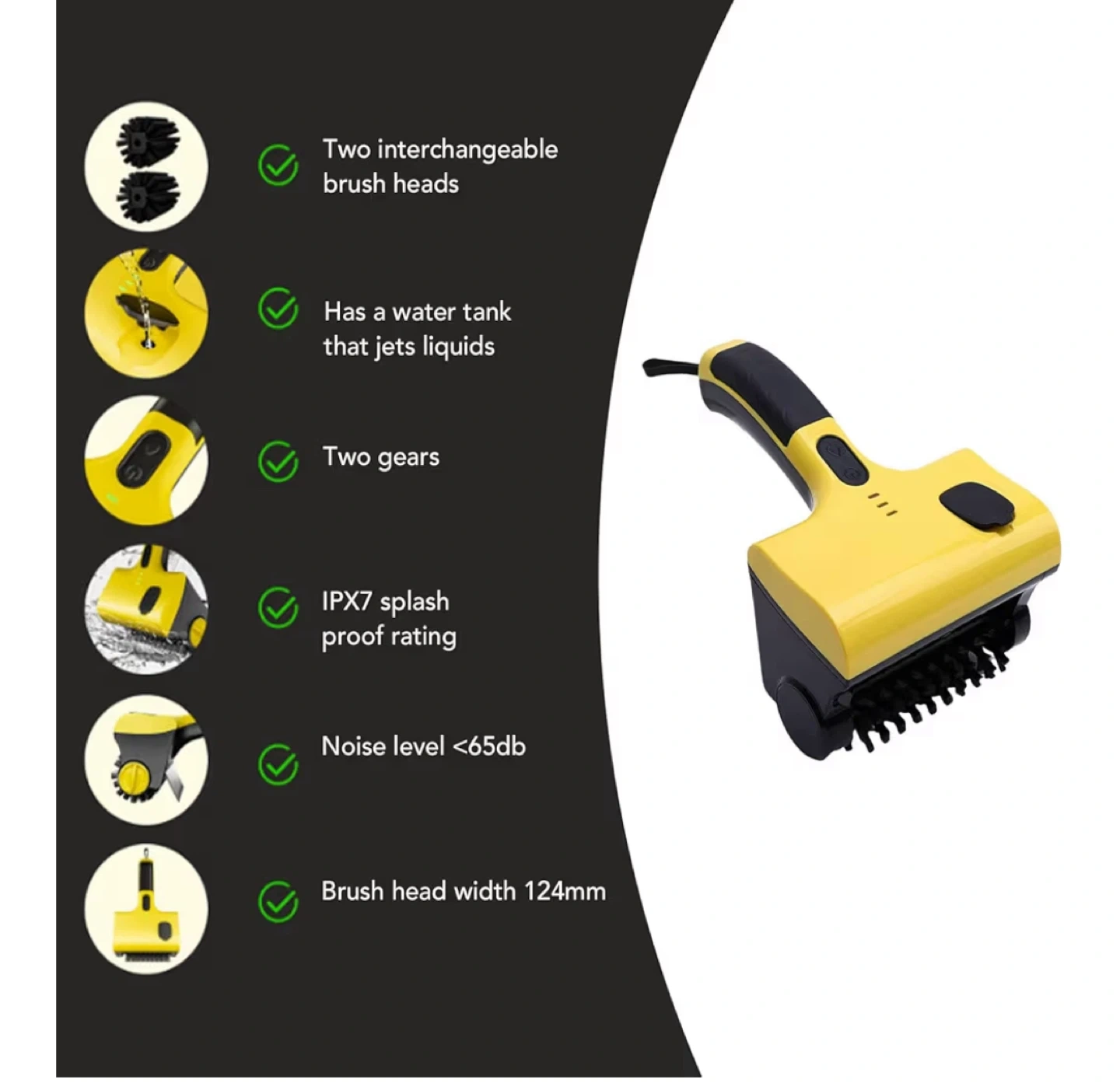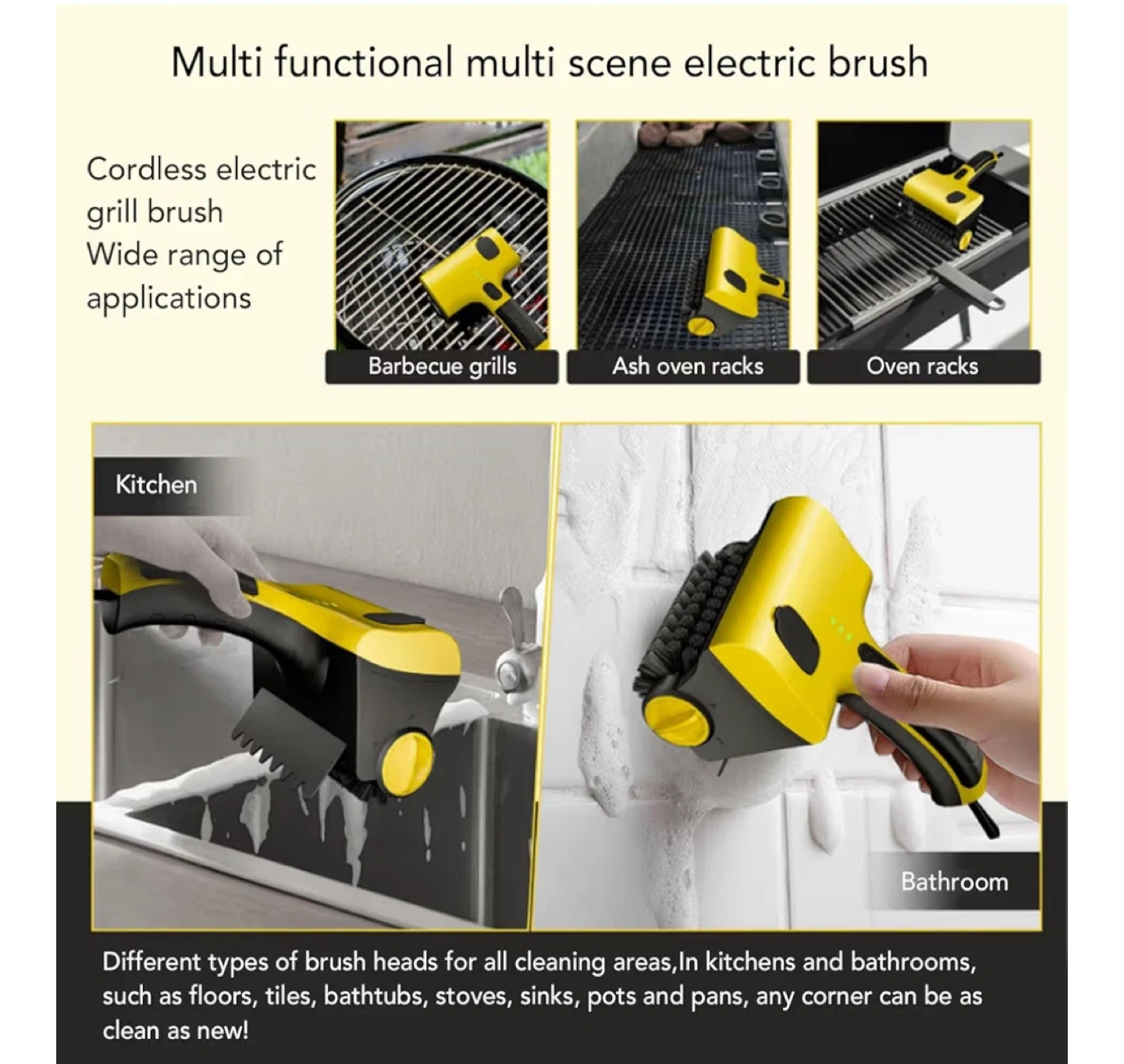 Selling an electric grill brush in yellow and black. It's a PURAMII DB1601 model. This brush is multi-functional and can be used on barbecue grills, ash oven racks, and oven racks. It's also great for cleaning in kitchens and bathrooms on surfaces like floors, tiles, bathtubs, stoves, sinks, pots, and pans. The brush head width is 124mm. It comes with two interchangeable brush heads and has a water tank that jets liquids. It also has an IPX7 splash-proof rating and a noise level less than 65db. Comes with the original box