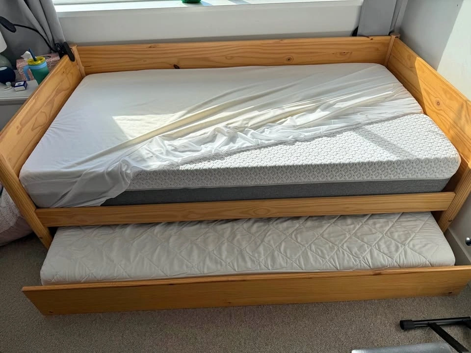 This twin bed frame has been well taken care of, and we're selling because my daughter wants a bigger bed. The top mattress is not included, but the trundle mattress can be included. The trundle has barely been used. Dimensions: Depth 40", Height 28", Length 78".