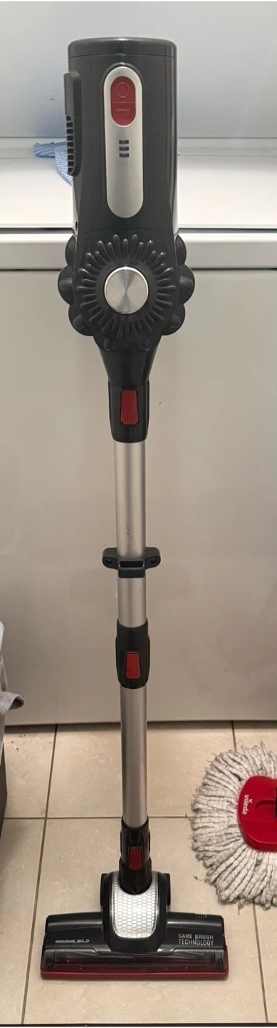 This RoomieTec vacuum features a cordless design for easy manoeuvring. It includes a main unit, motorized floor head, HEPA filter, and extension tubes. A wall mount is also provided for convenient storage.