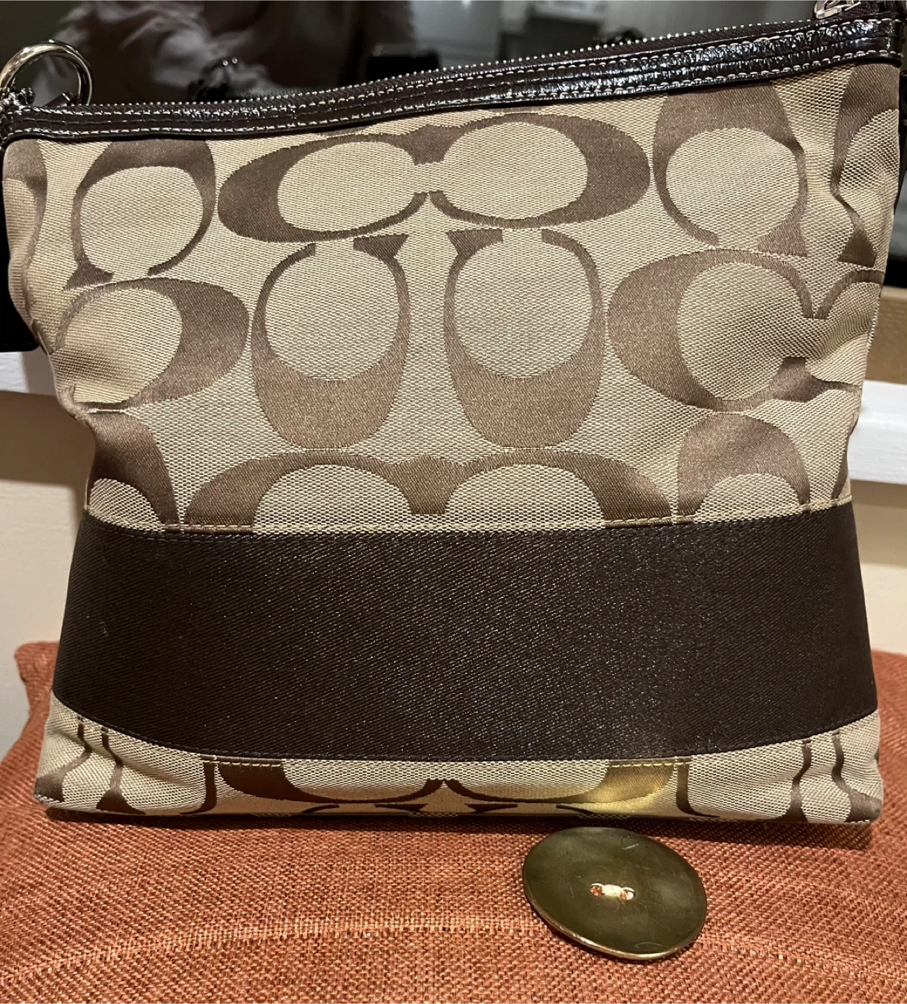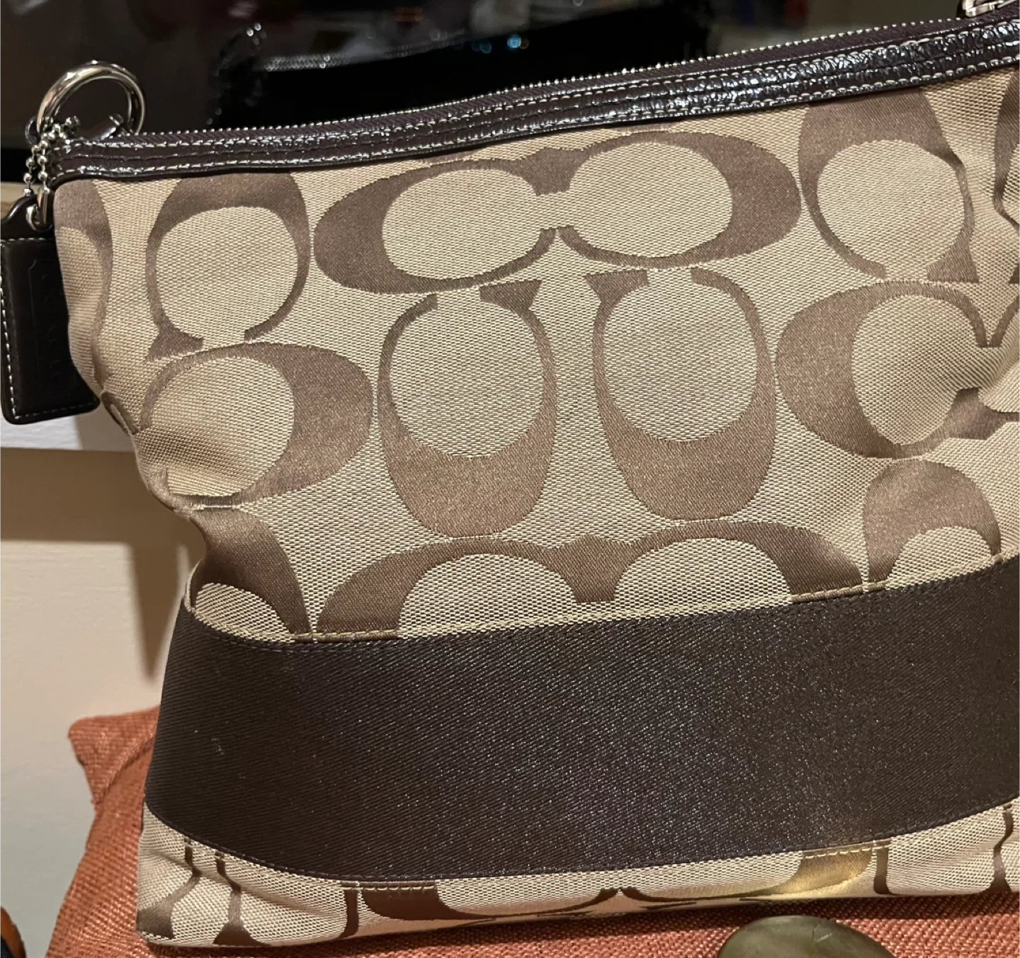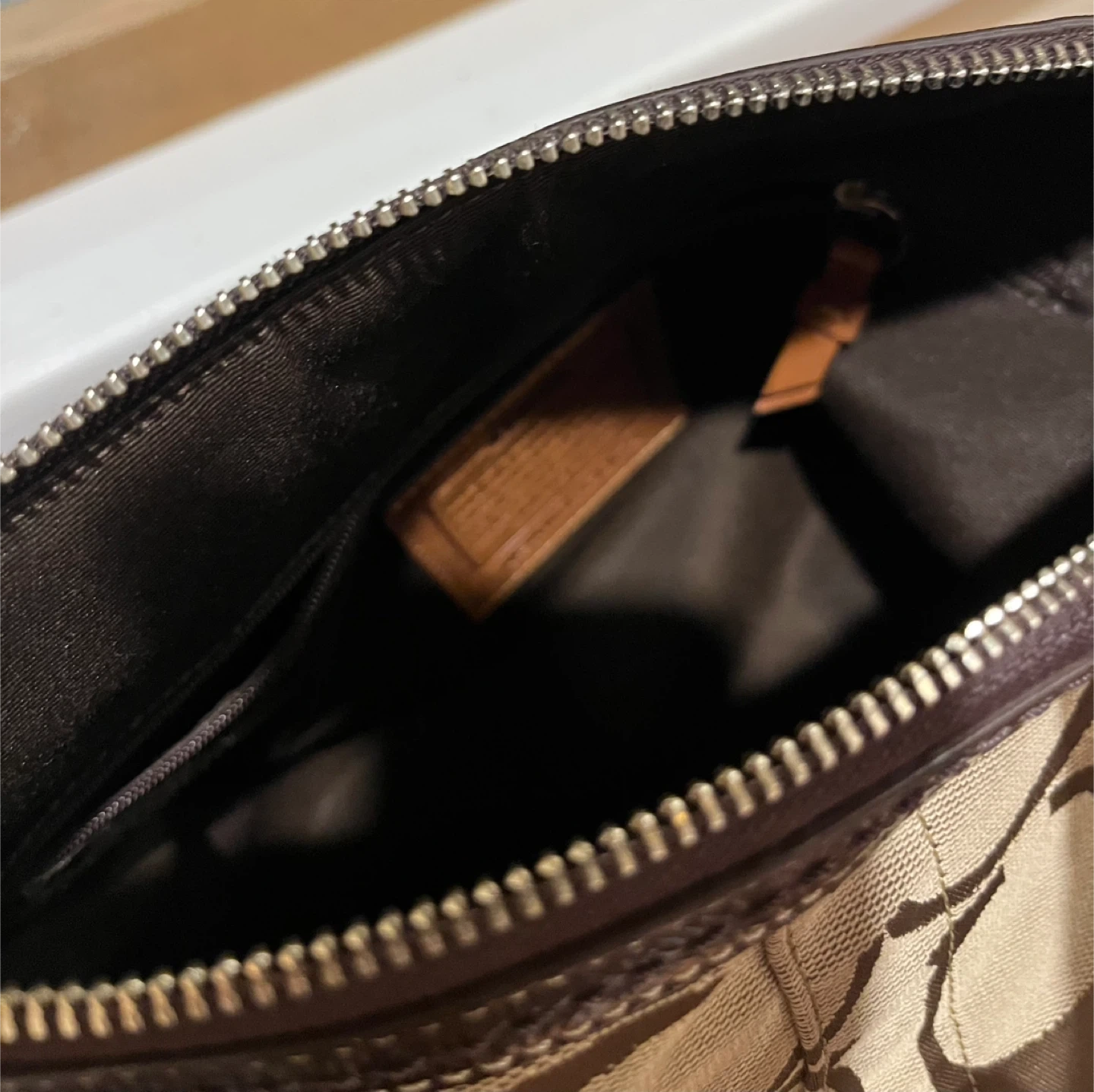 A cute Coach handbag featuring the classic brown signature print. It's in great condition and perfect for everyday use. The bag has a zipper closure and a stylish design.