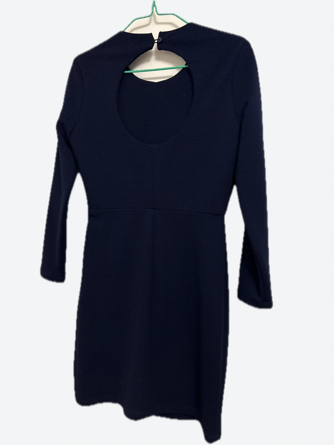 AX | Armani Exchange navy blue dress. It has long sleeves and a keyhole cutout at the back with a button closure. Material appears to be a textured knit.