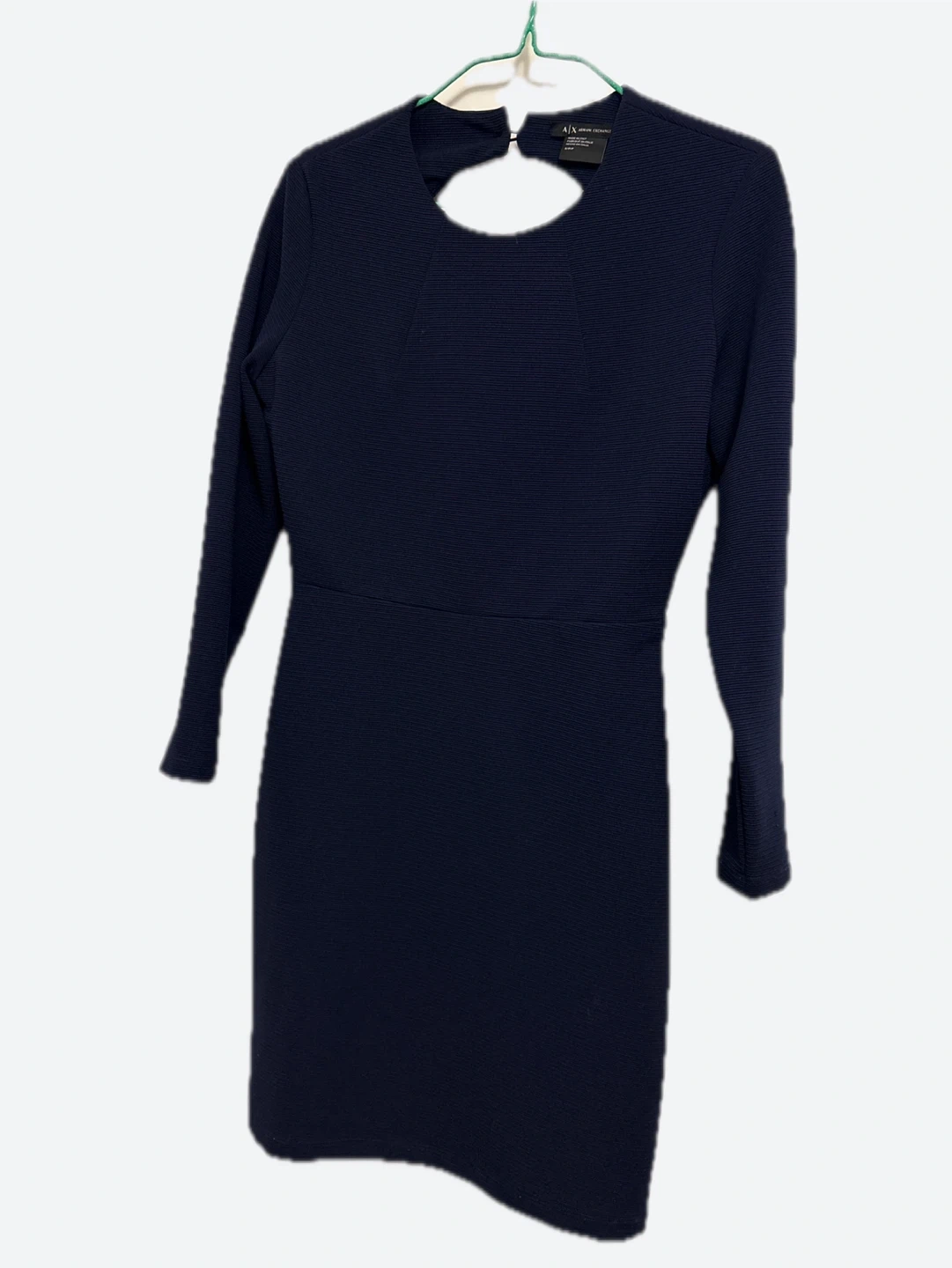 AX | Armani Exchange navy blue dress. It has long sleeves and a keyhole cutout at the back with a button closure. Material appears to be a textured knit.