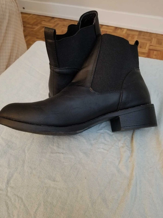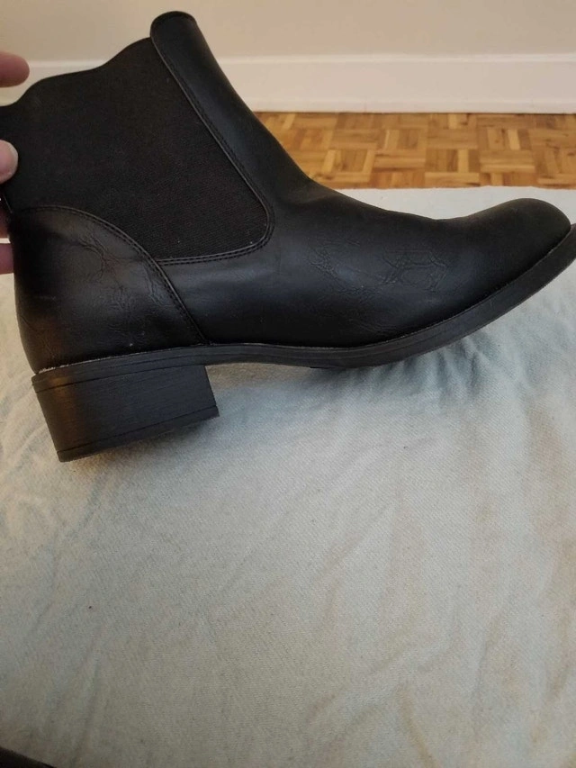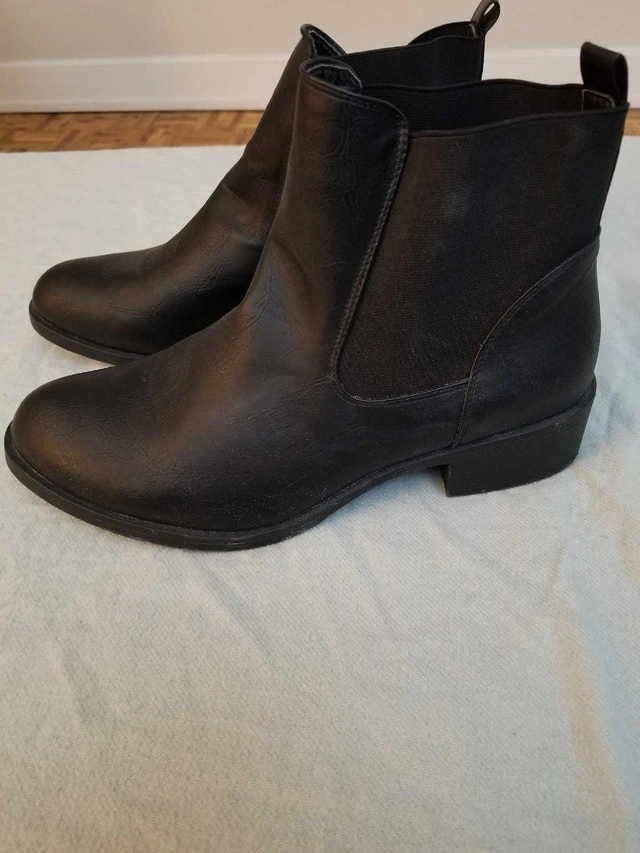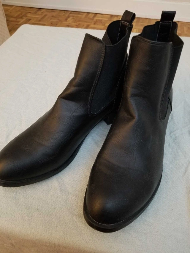 Step out in style with these Streetwear Society black ankle boots, perfect for adding a sleek touch to any outfit. They are marked as a size 10 and are in good condition, showing only slight signs of wear. These boots are ready for a new adventure. If the ad is up, these fashionable boots are still available.