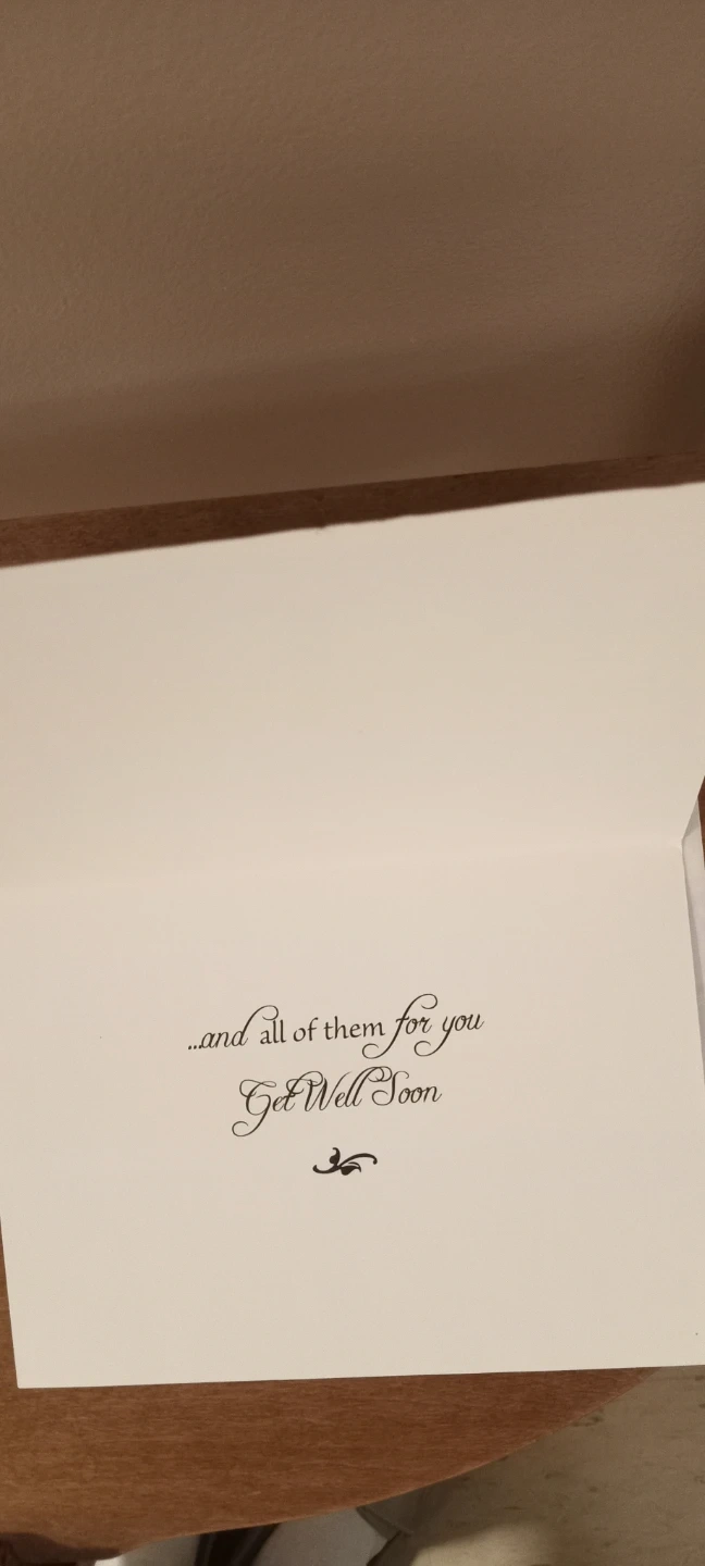 A sweet card featuring a sleeping kitten surrounded by flowers. The front reads 'Warm and Caring Thoughts'. Inside it says '...and all of them for you. Get Well Soon'. Perfect for sending well wishes.