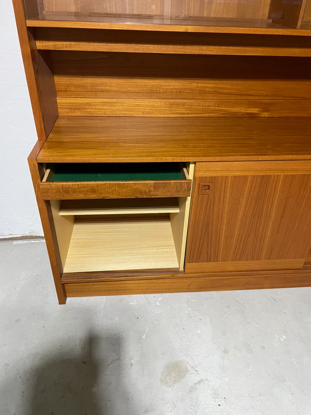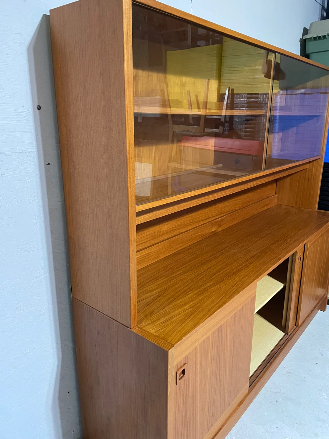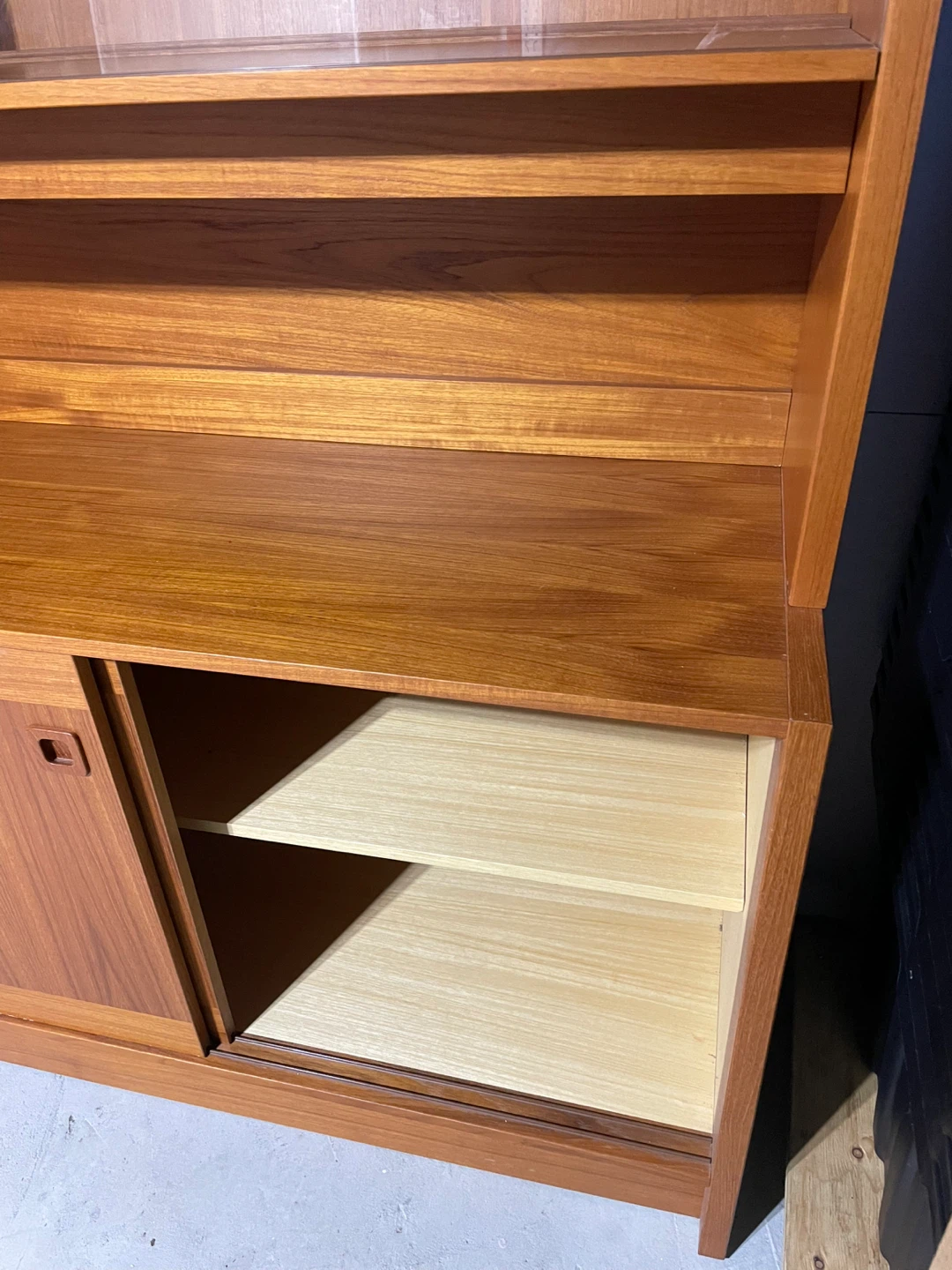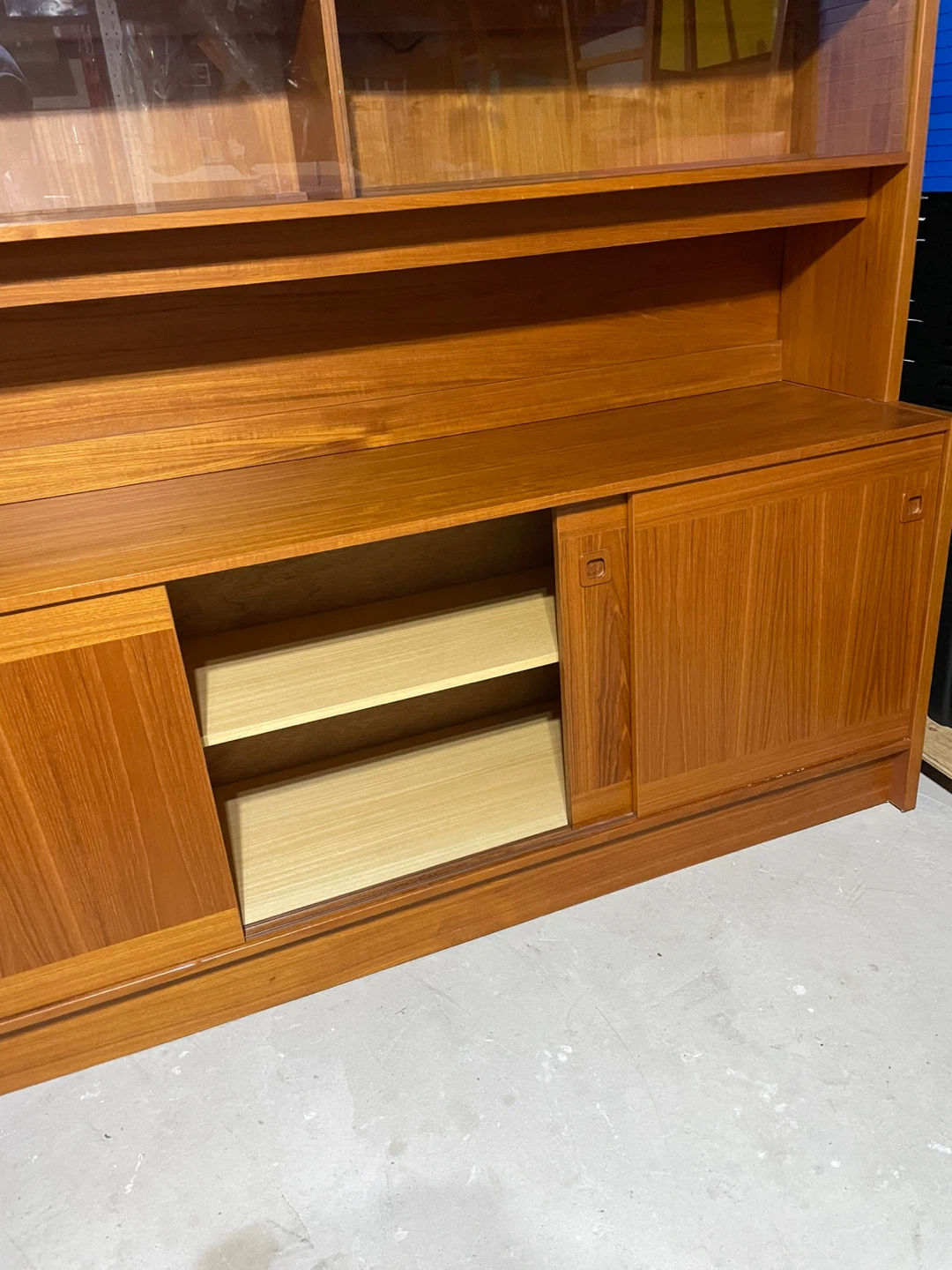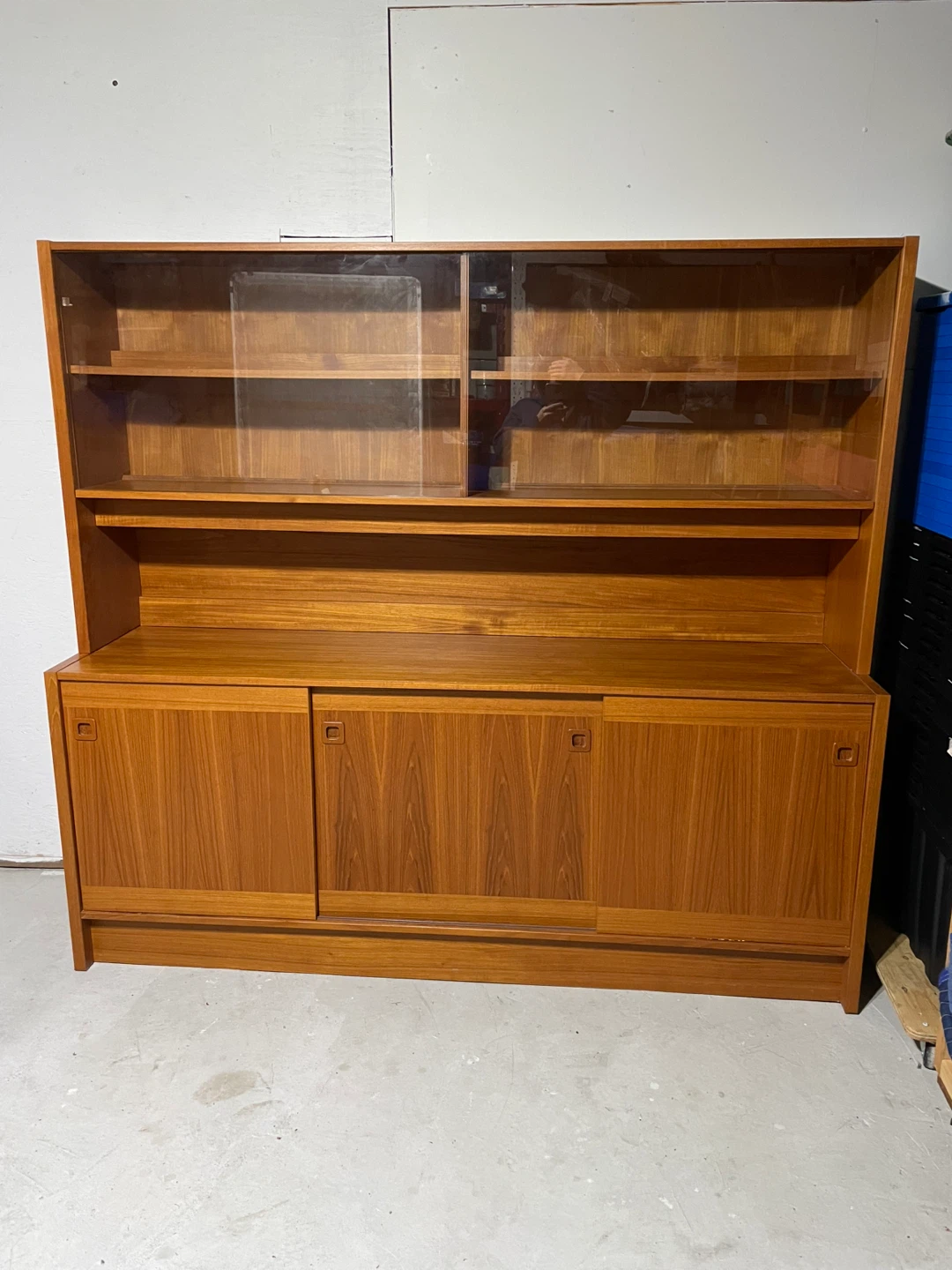 Here's a lovely teak hutch. It features a glass display case on top and a cabinet with sliding doors below. It's a great piece for adding storage and style to any room.