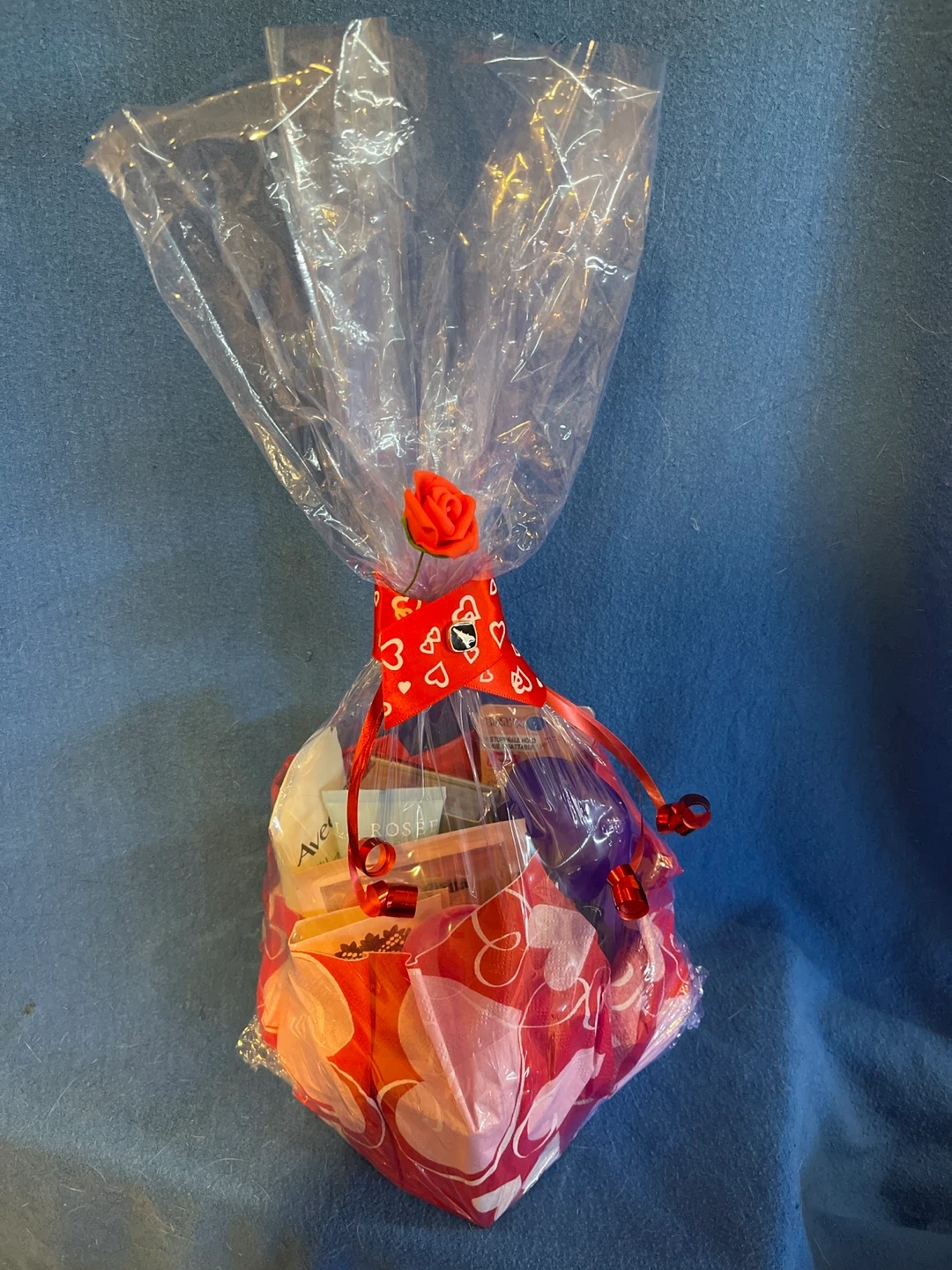 This gift basket is filled with a variety of beauty items. It's wrapped in cellophane with a red ribbon and a decorative rose. This could be a nice gift for someone special!