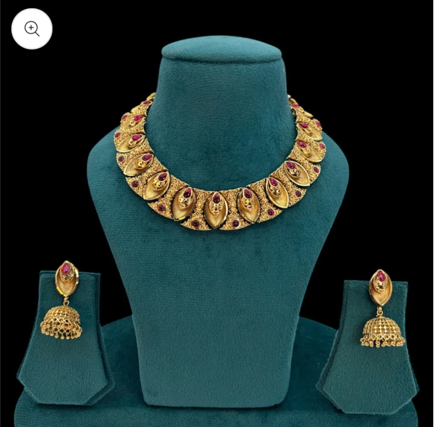 This is a gold-toned necklace and earring set featuring intricate detailing and small red stones. The set includes a statement necklace and matching jhumka-style earrings. It's a lovely set for special occasions!