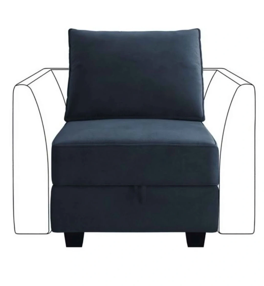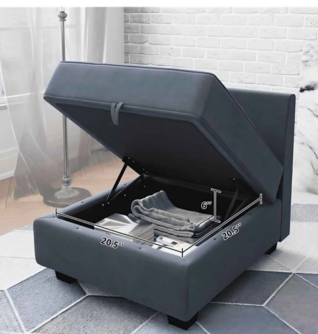This versatile ottoman chair offers comfortable seating and hidden storage. It's upholstered in a dark grey fabric. Inside dimensions are 20.5" x 20.5" x 6". Brand new in Box