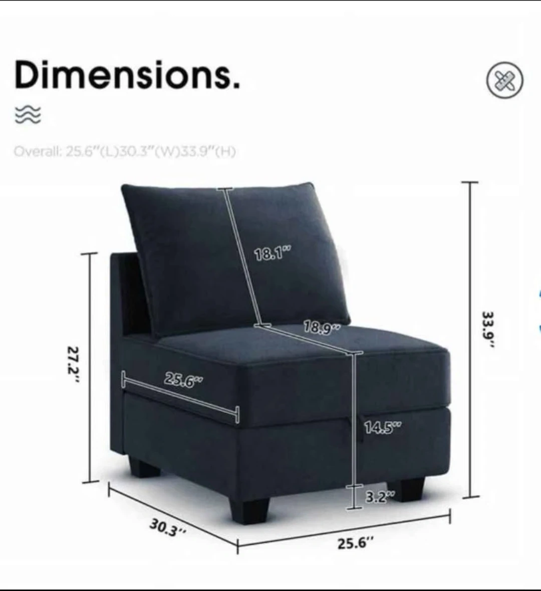 This versatile ottoman chair offers comfortable seating and hidden storage. It's upholstered in a dark grey fabric. Inside dimensions are 20.5" x 20.5" x 6". Brand new in Box