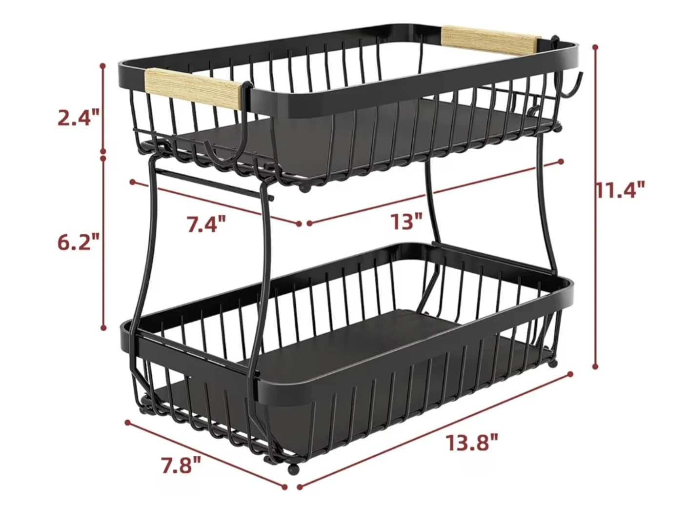 This two-tier wire basket is designed for storing fruits and vegetables. It's made of metal with wooden accents on the handles. The open design allows for good air circulation, keeping produce fresh. It's useful for organizing your kitchen counter.