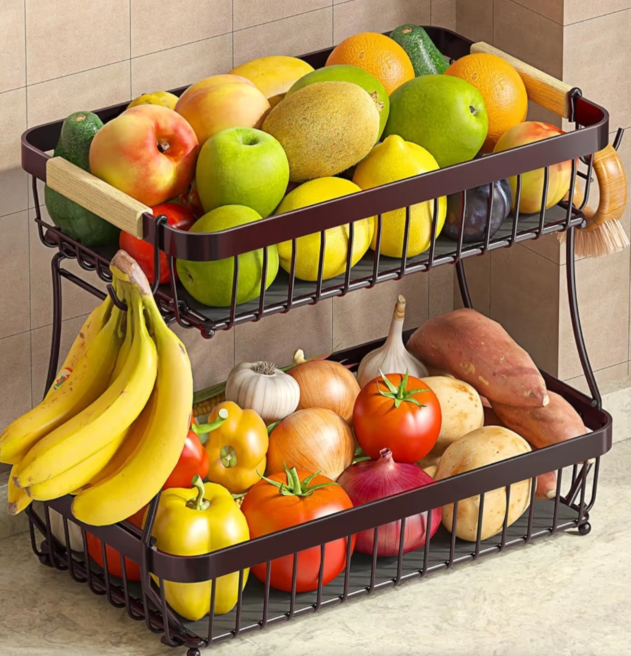 This two-tier wire basket is designed for storing fruits and vegetables. It's made of metal with wooden accents on the handles. The open design allows for good air circulation, keeping produce fresh. It's useful for organizing your kitchen counter.