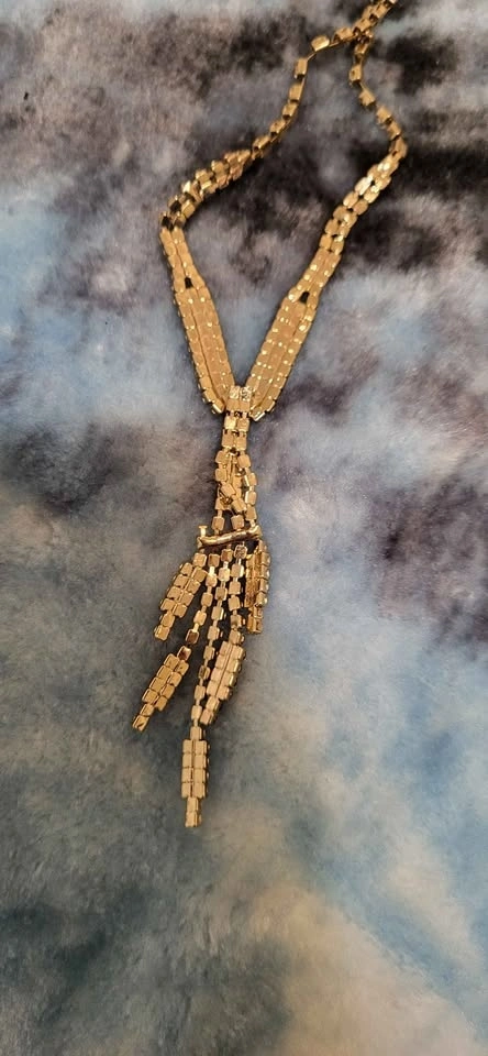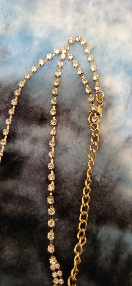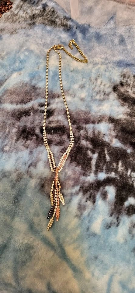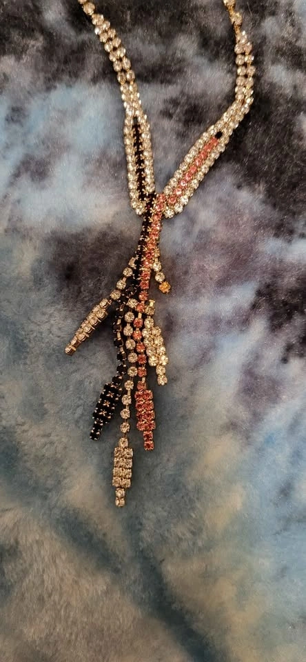 Sparkly rhinestone necklace with clear, pink, and black stones. Gold tone metal. Lariat style with dangling strands. Lobster clasp with extender chain.