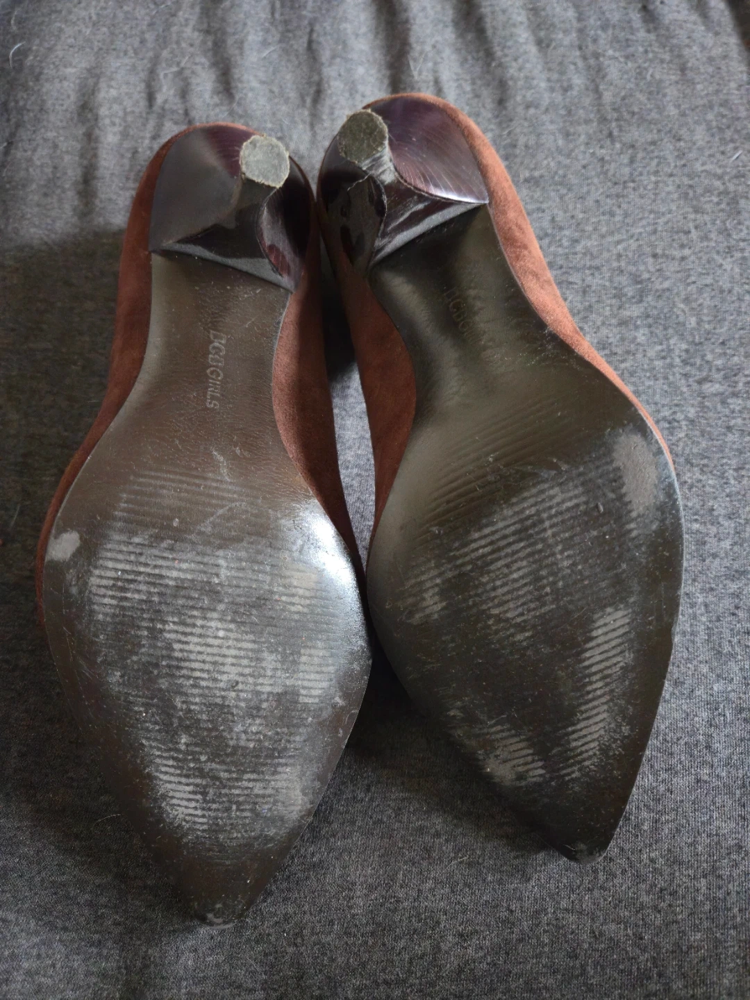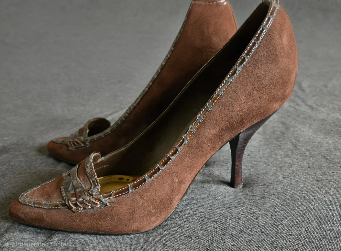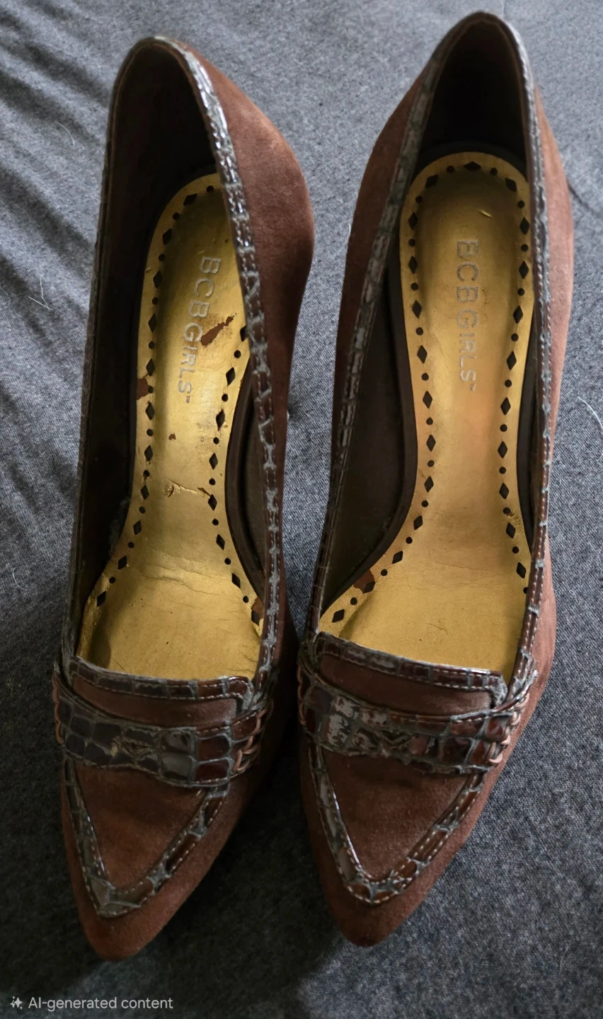 BCBGirls brown suede pumps with faux crocodile trim. Features a pointed toe and stiletto heel. These shoes are stylish and suitable for various occasions.