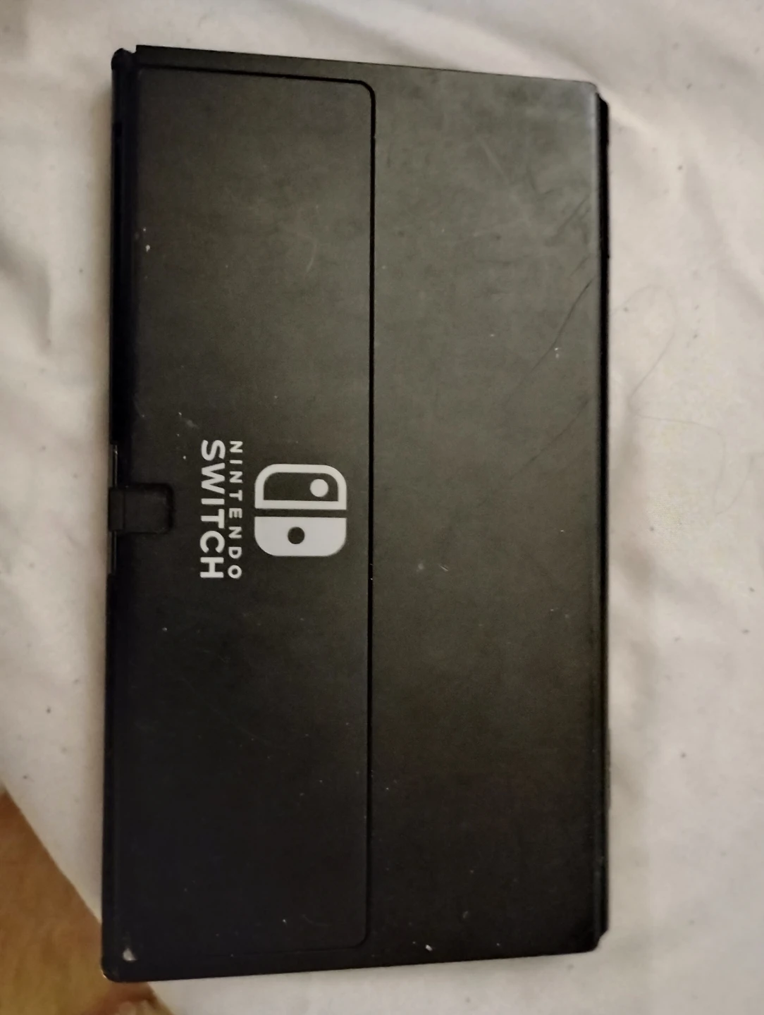This is a black Nintendo Switch console. It's a versatile gaming system for at home or on the go. The device has a clear display