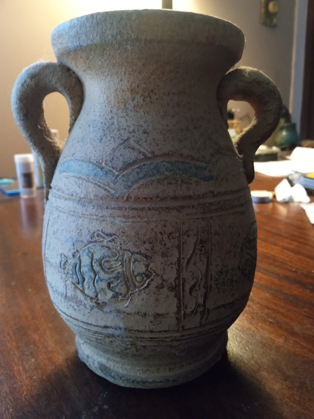 A textured ceramic vase with a rustic, aged finish. It features raised decorative elements including fish and starburst patterns. This decorative piece would look great on a shelf or mantelpiece.