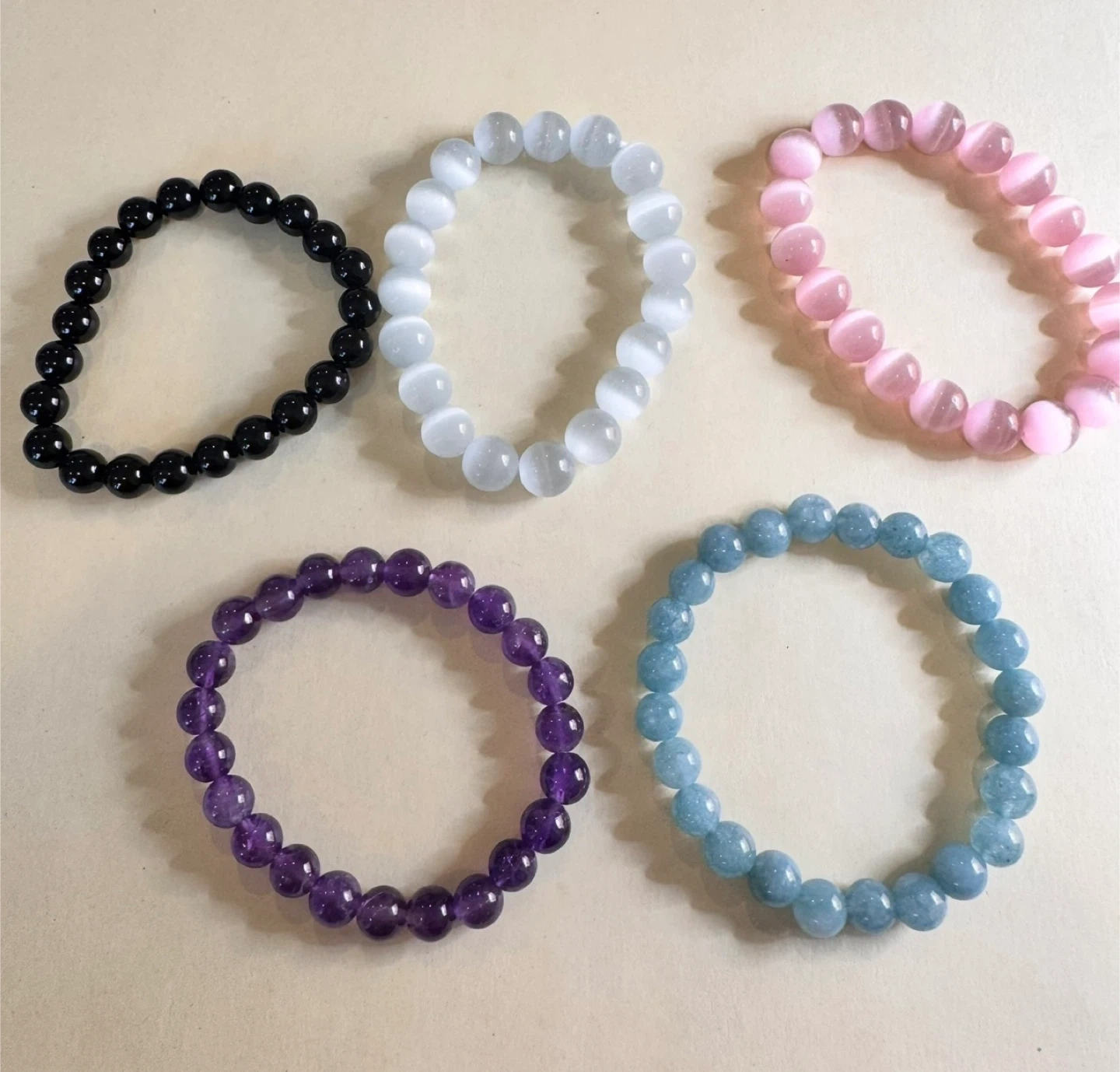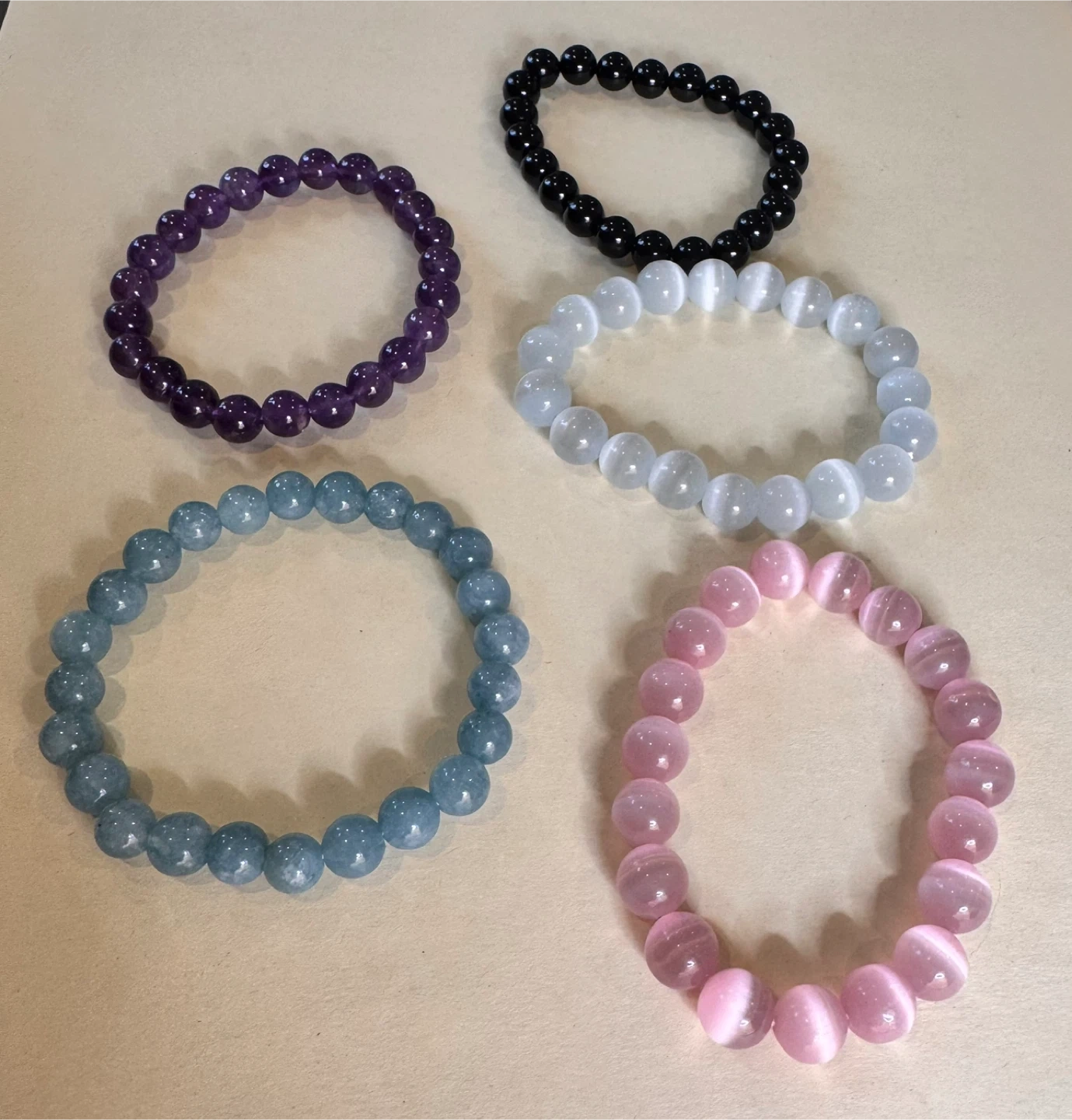 ❣️A set of five stretchy beaded bracelets in various colours. Includes black, white, pink, purple, and blue beads. Elastic bands make them easy to wear. These bracelets add a pop of colour to any outfit!