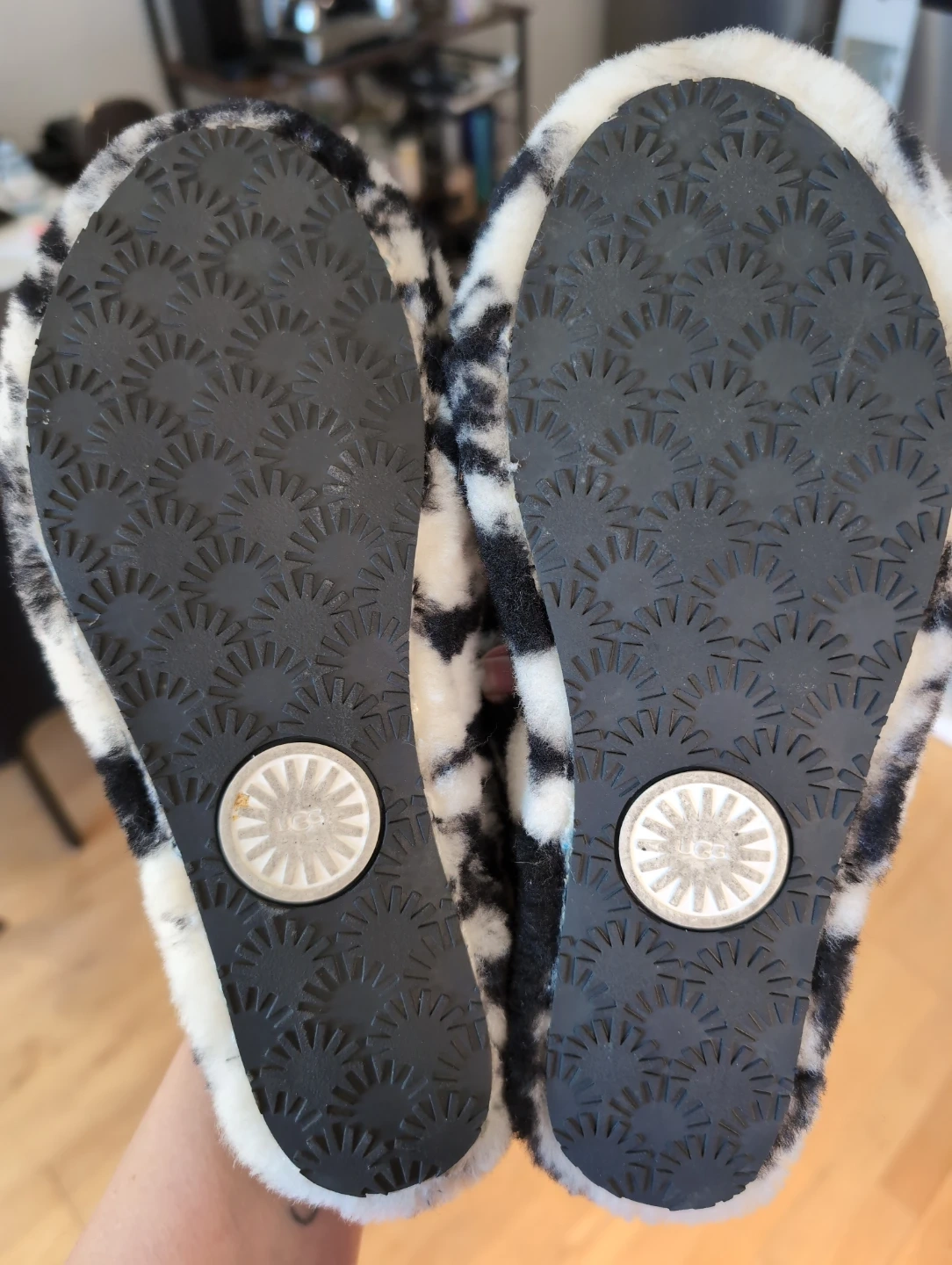 Comfy Ugg Fluff Yeah slide slippers in a black and white tie-dye pattern. Like new, only worn a couple times.