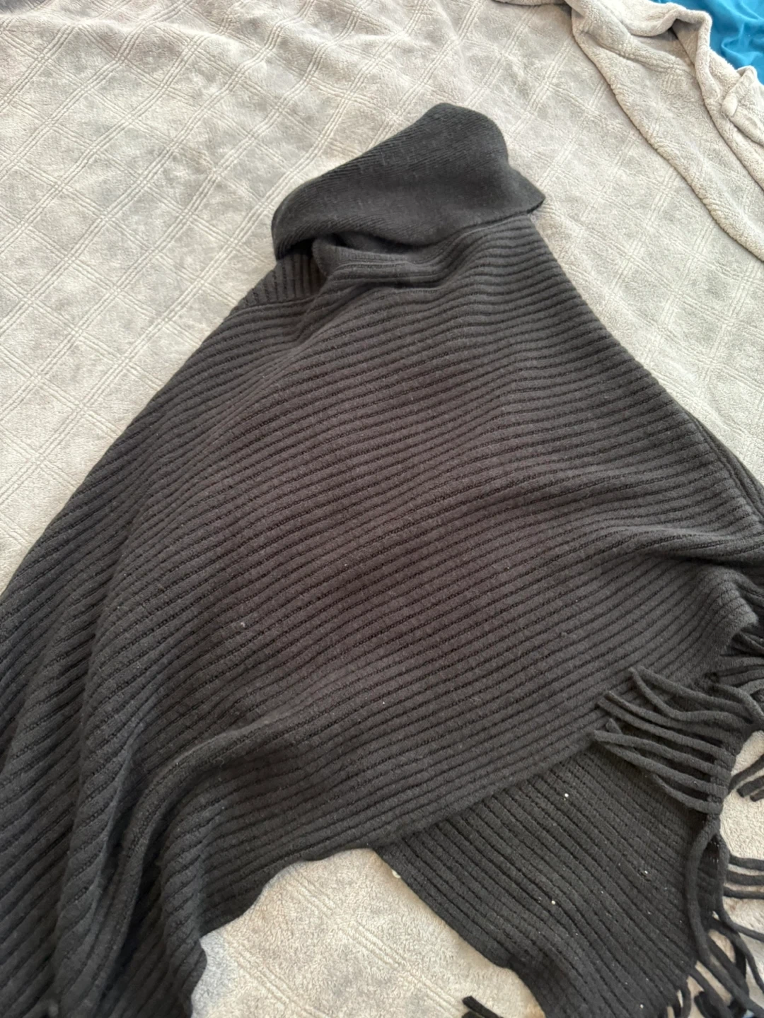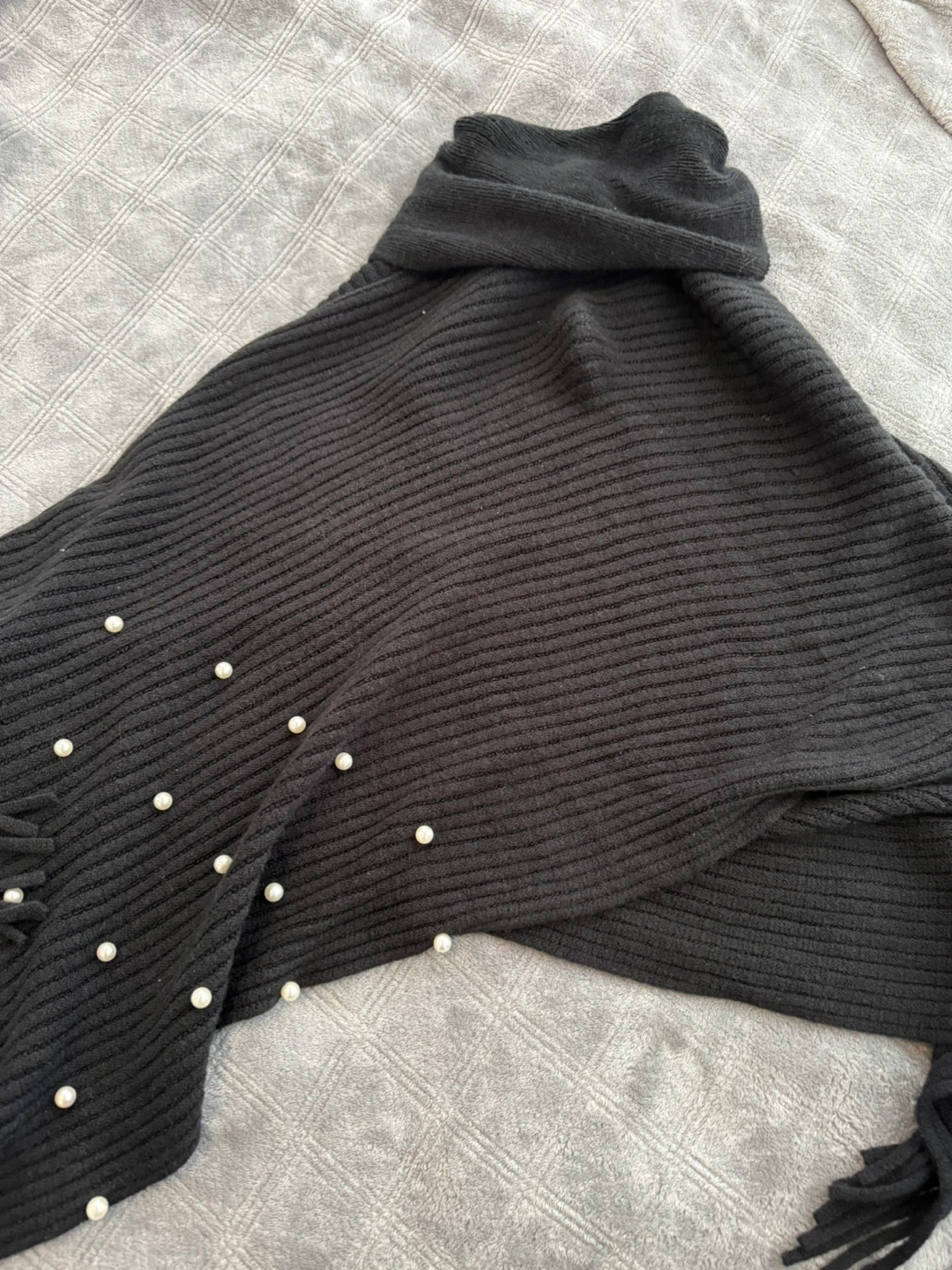 Cozy black knit poncho featuring a stylish cowl neck and fringed hem. It's embellished with scattered faux pearls for a touch of elegance. I got it from urban planet but I've not had the opportunity to wear it